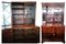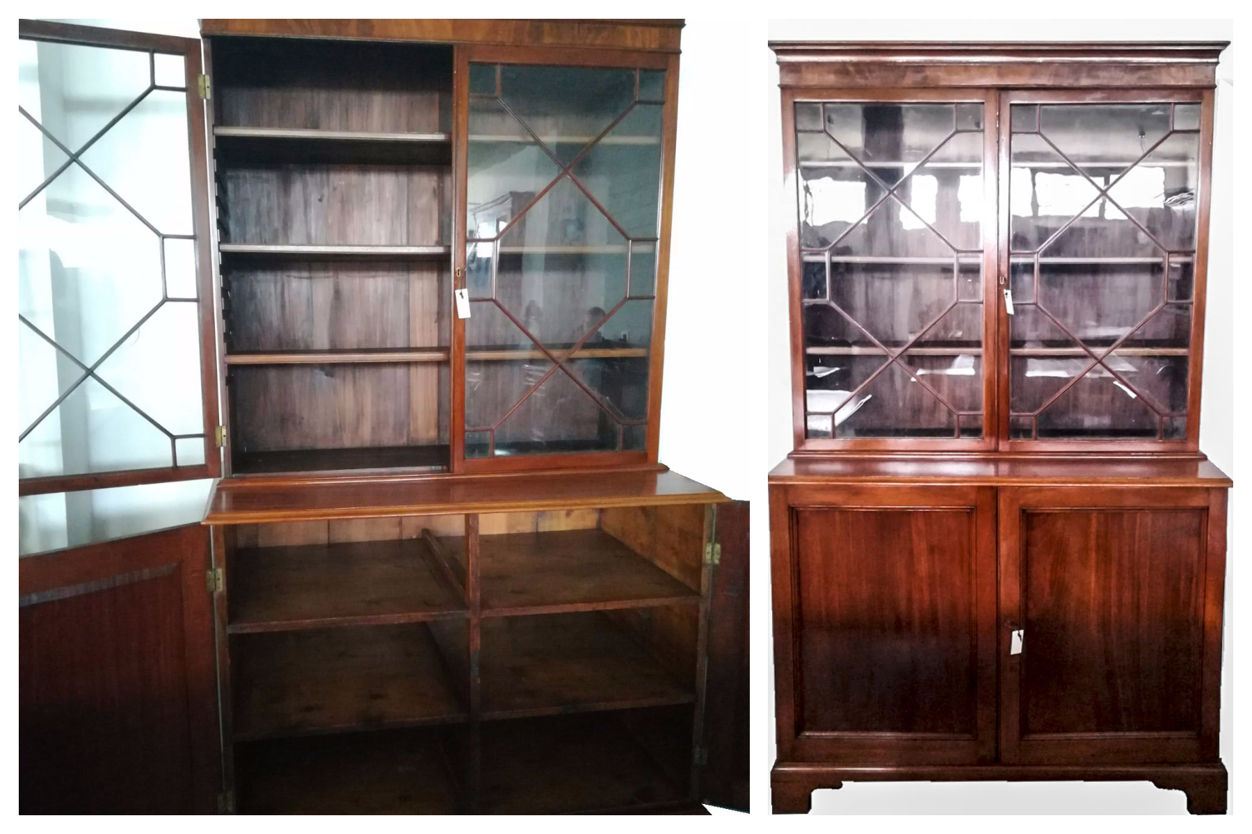 CREDENZA / VETRINA. Elegante credenza a doppio corpo composta da un ampio vano nella parte superiore, suddiviso all'interno da tre mensole, chiudente a due ante in vetro imprezziosite da un disegno geometrico con sottili lesene decorative. La parte inferiore del mobile chiude con due ante in legno. Le serrature sono entrambe funzionanti. La credenza vetrina e di buona capienza. Dimensioni H 202 cm, L 117 cm, P 58 cm.