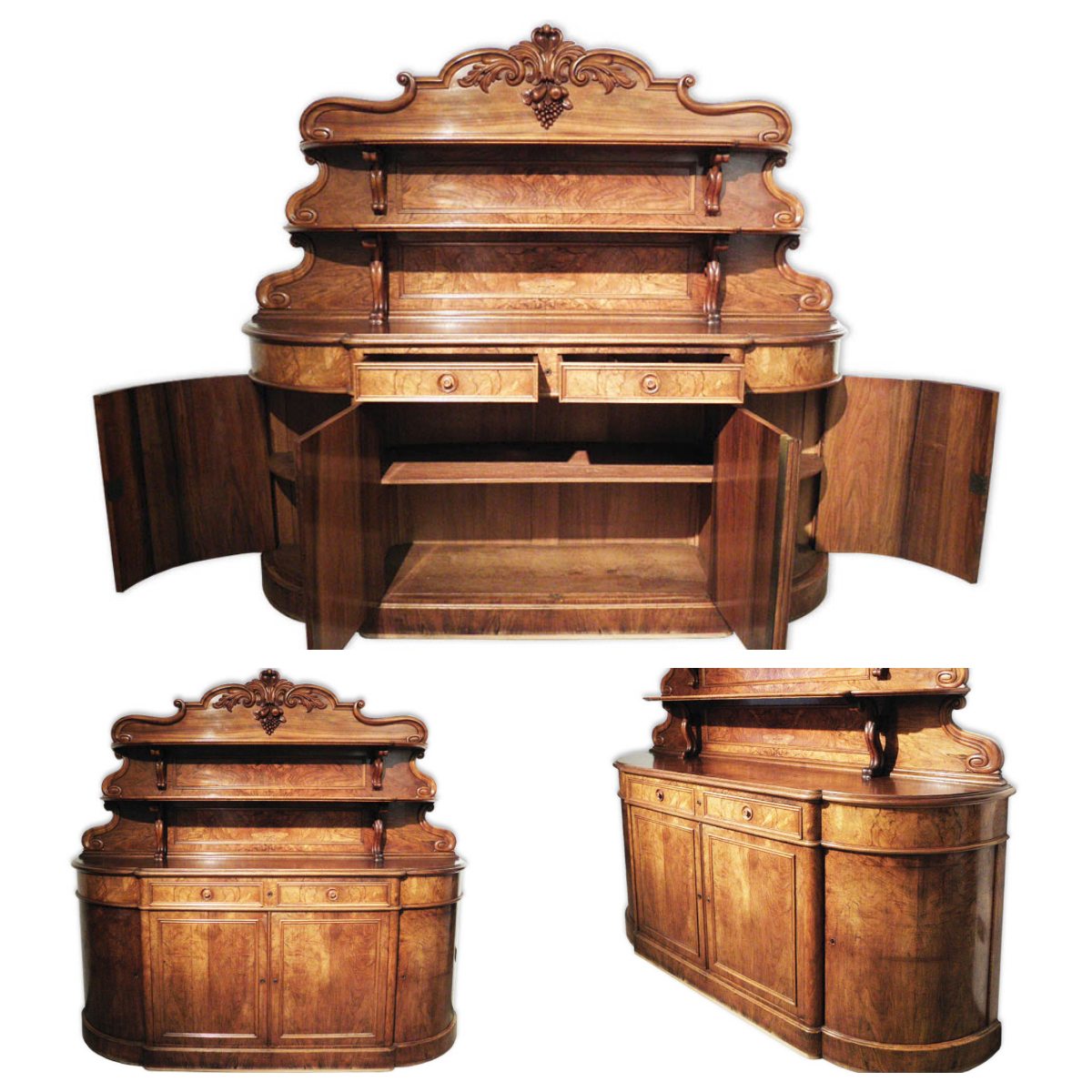 Credenza scantonata, di grande fascino e gusto, in radica di noce con quattro ante di cui due angolari e due cassetti centrali, decorata con mezze colonne scanalate. Alzata con piattaia a mensole e montanti mossi, cimasa intagliata a motivi vegetali. Mobile non completo di chiavi, si presenta in buone condizioni e di ottima capacità. Dimensioni: H 200 cm, L 224 cm, P 52 cm.