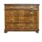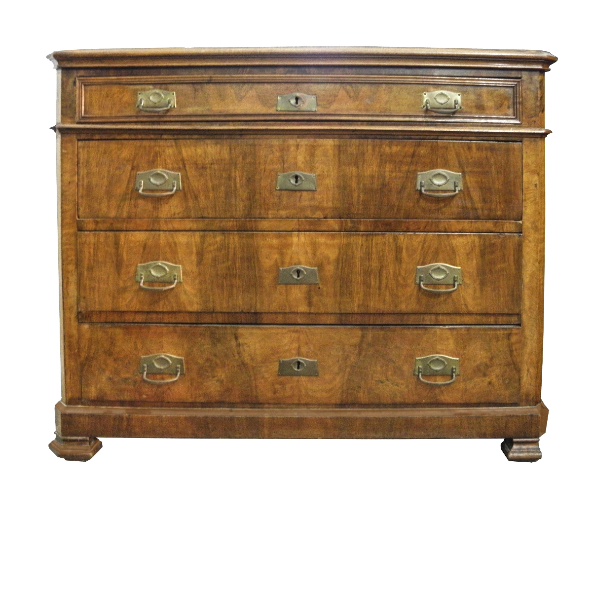 Comò composto da 4 cassetti di cui uno sottopiano racchiuso da una cornice intagliata. Il Piano, la base ed i piedi sono sagomati per dare movimento al prospetto del mobile che è molto semplice e lineare. I cassetti hanno maniglie laterali e bocchetti centrali in metallo. Nel complesso il mobile si presenta bene, parte del piede destro mancante.