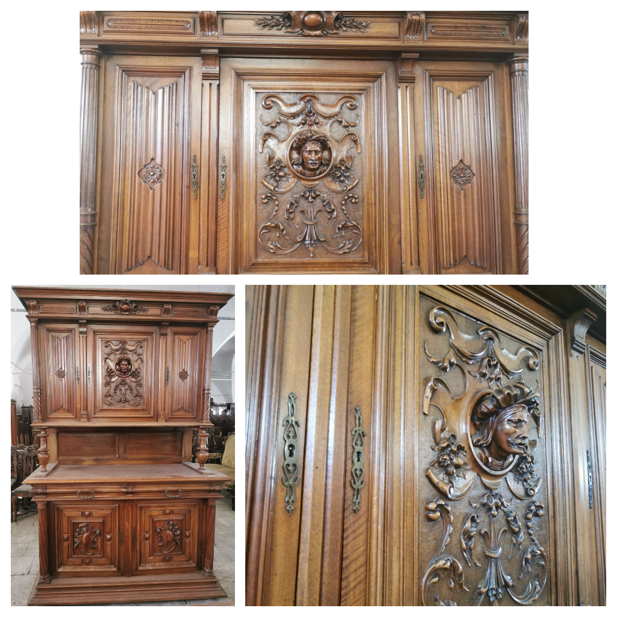 CREDENZA CON ALTO RILIEVO. Credenza in noce, interno in rovere, a 2 corpi, 3 ante superiori. Particolarissimo pannello centrale con volto in rilievo.