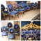 SALOTTO BLU. Salotto composto da n. 1 divano, n. 4 poltrone e n. 4 sedie. Il salotto è rivestito in seta ricamata. Dimensioni: divano = seduta 164x64 cm, spalliera 132x60 cm; poltrone = seduta 68x53 cm, spalliera 132x60 cm; sedie = seduta 51x52cm, spalliera 39x57cm.