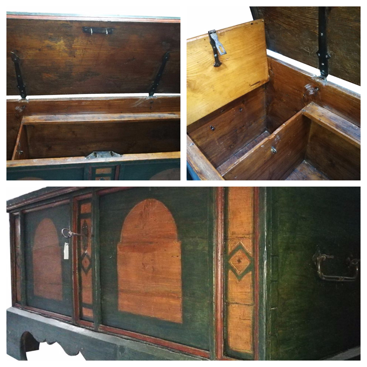 Cassone dipinto molto capiente. Dimensioni: H 92 cm, L 180 cm, P 65 cm.