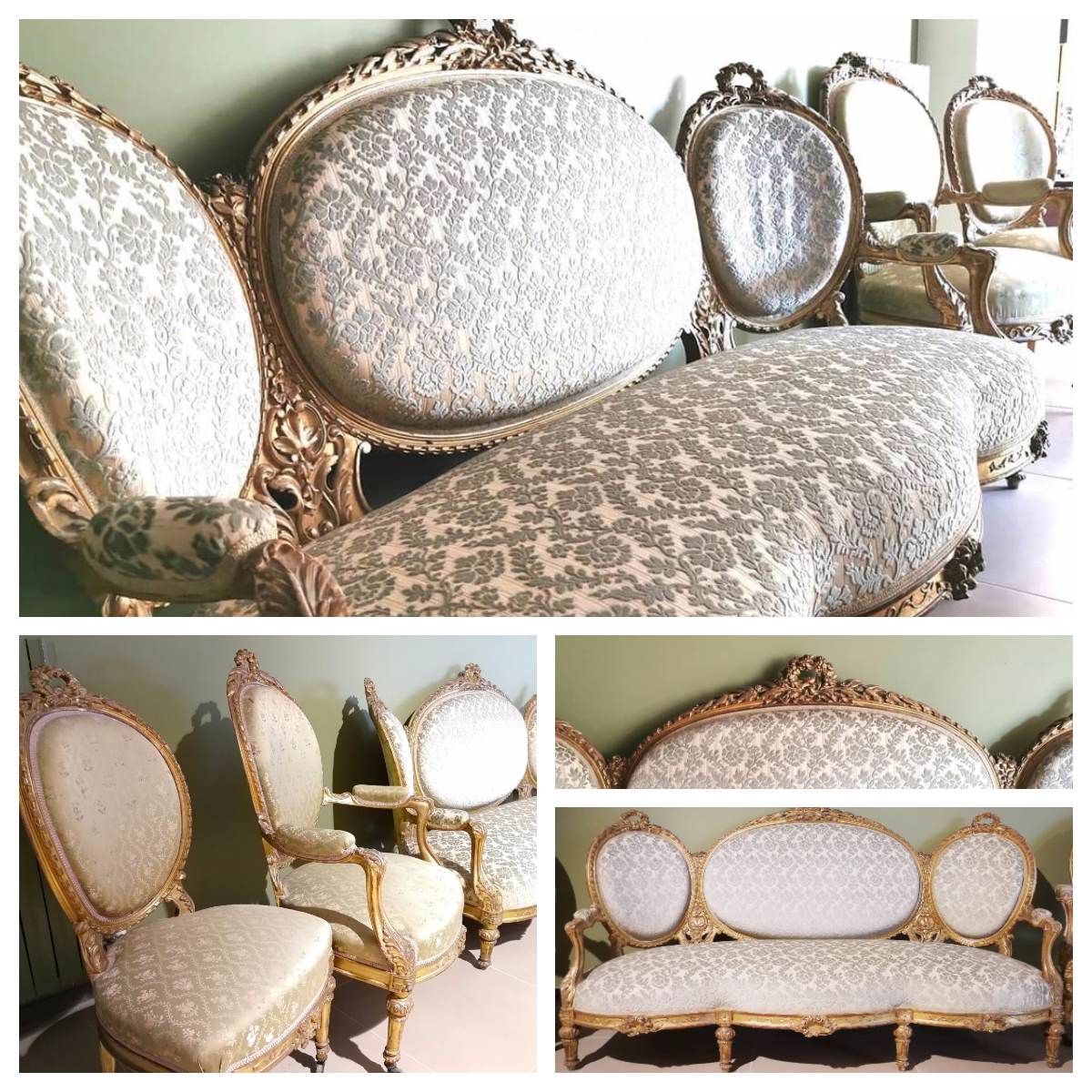 SALOTTO in stile Luigi XVI con intagli floreali. N 2 Poltrone (Seduta 63x58,Spalliera 39x48). N2 Sedie (Seduta 51x47, Spalliera 32x42). Divano (193x76xH108). Presenti segni del tempo.