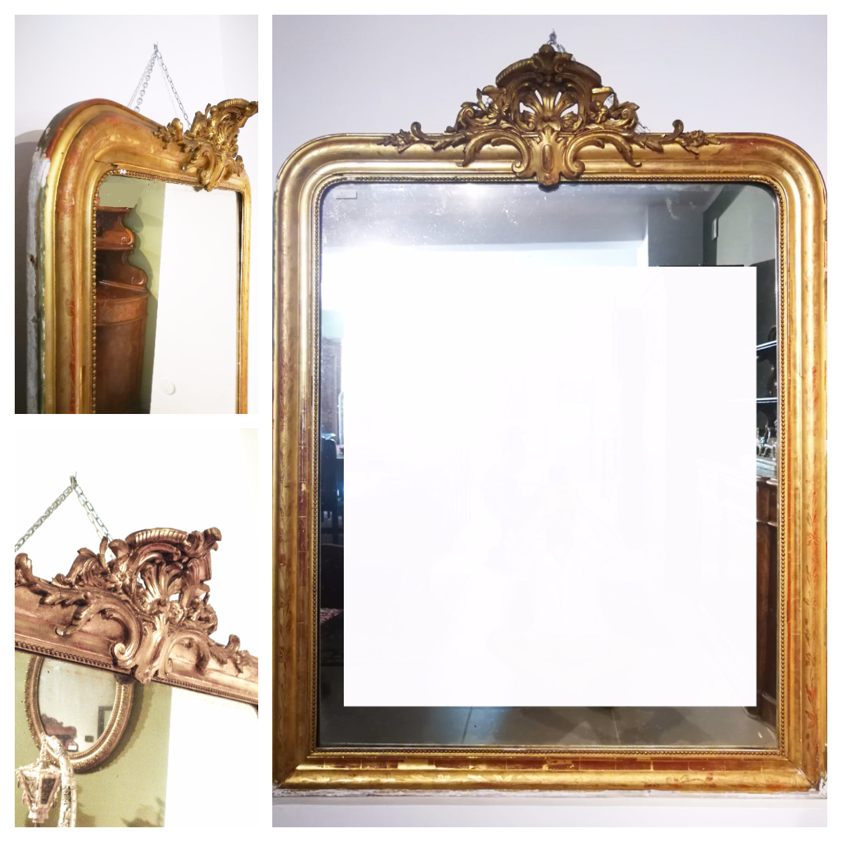 Specchiera in stile L. Filippo con perlage interno e incisioni floreali sulla cornice, cimasa intagliata. Sono presenti segni del tempo. Dimensioni:H 165 cm, L 128 cm.