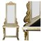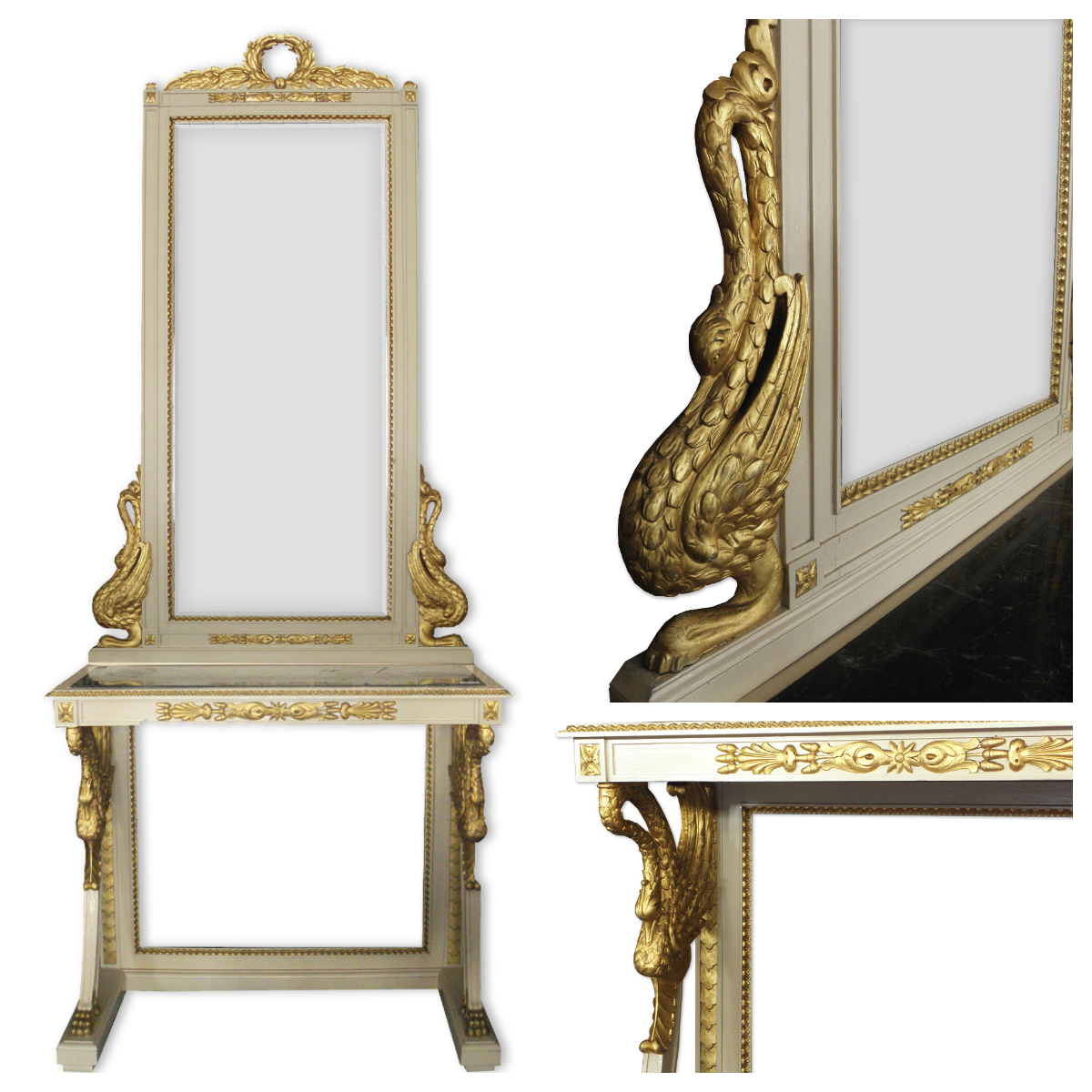 CONSOLLE. Particolare console in legno intagliato e laccato in color panna e oro. Il mobile è arricchito dal piano in marmo verde e sorretto da una coppia di cigni finemente lavorati. La console richiama fortemente lo stile Impero nella sua composizione, oltre all’elemento iconografico dei cigni, vediamo che i sostegni poggiano su un basamento rettangolare con fondo qui mancante ma, solitamente a specchio. Lo specchio nella parte superiore è bisellato e completa il mobile con cornice sui fianchi intagliati a cigni monopodi e cimasa e fasce decorate con motivi fogliati. In buono stato conservativo. Dimensioni: H 281 cm, L 113 cm, P 43 cm.