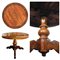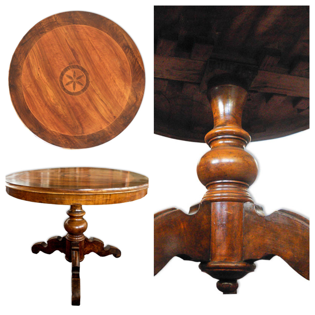 Tavolo rotondo in noce biondo e scuro. Piano con intarsi geometrici circolari in bosso e larice cimolo, gamba tornita su tre piedi sagomati. Dimensioni: H 72,5 cm, L 98 cm, P 98 cm.
