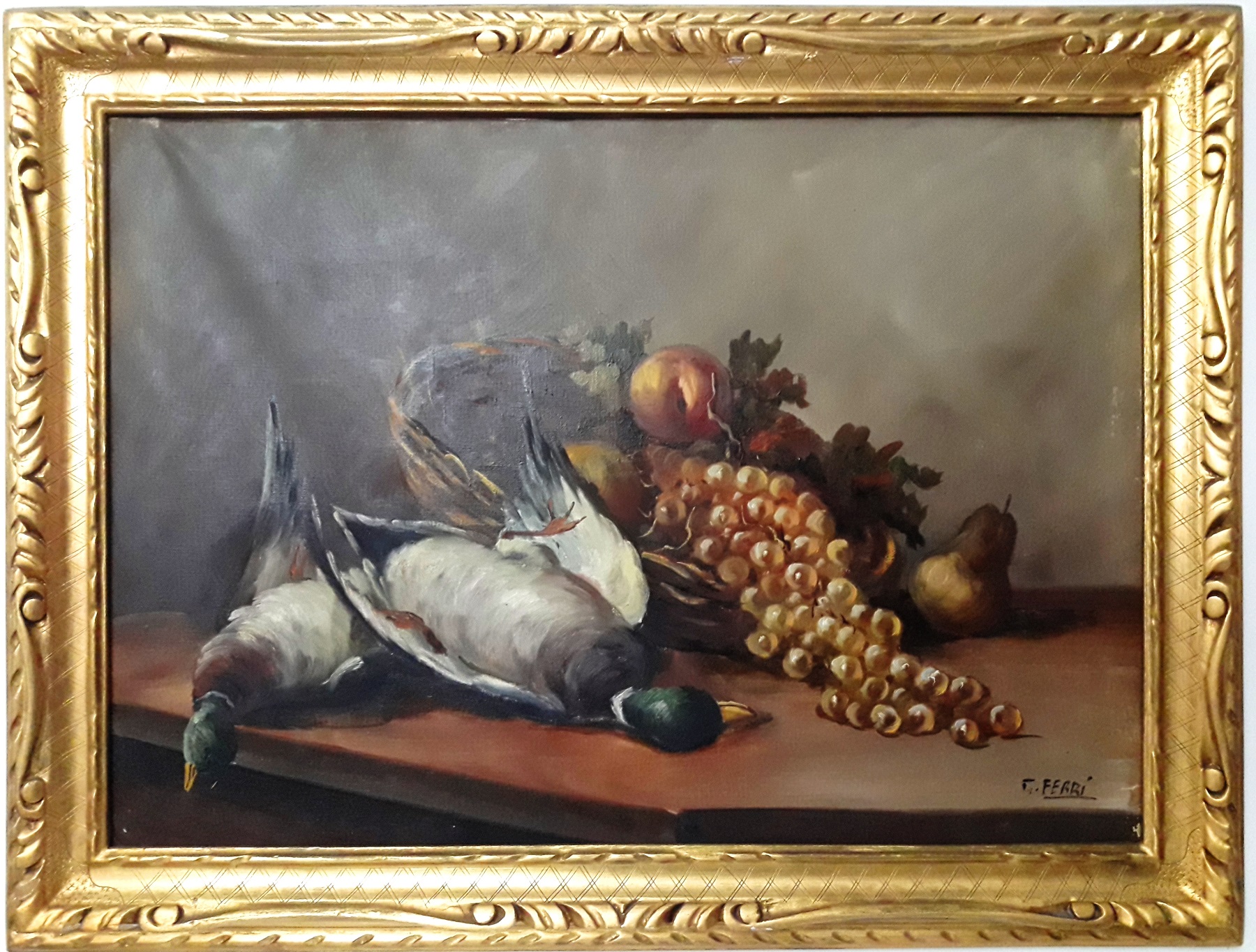 OLIO SU TELA .Rappresentante natura morta, firmata F. Ferri. Dimensioni tela cm 70x48, cornice cm 84x64