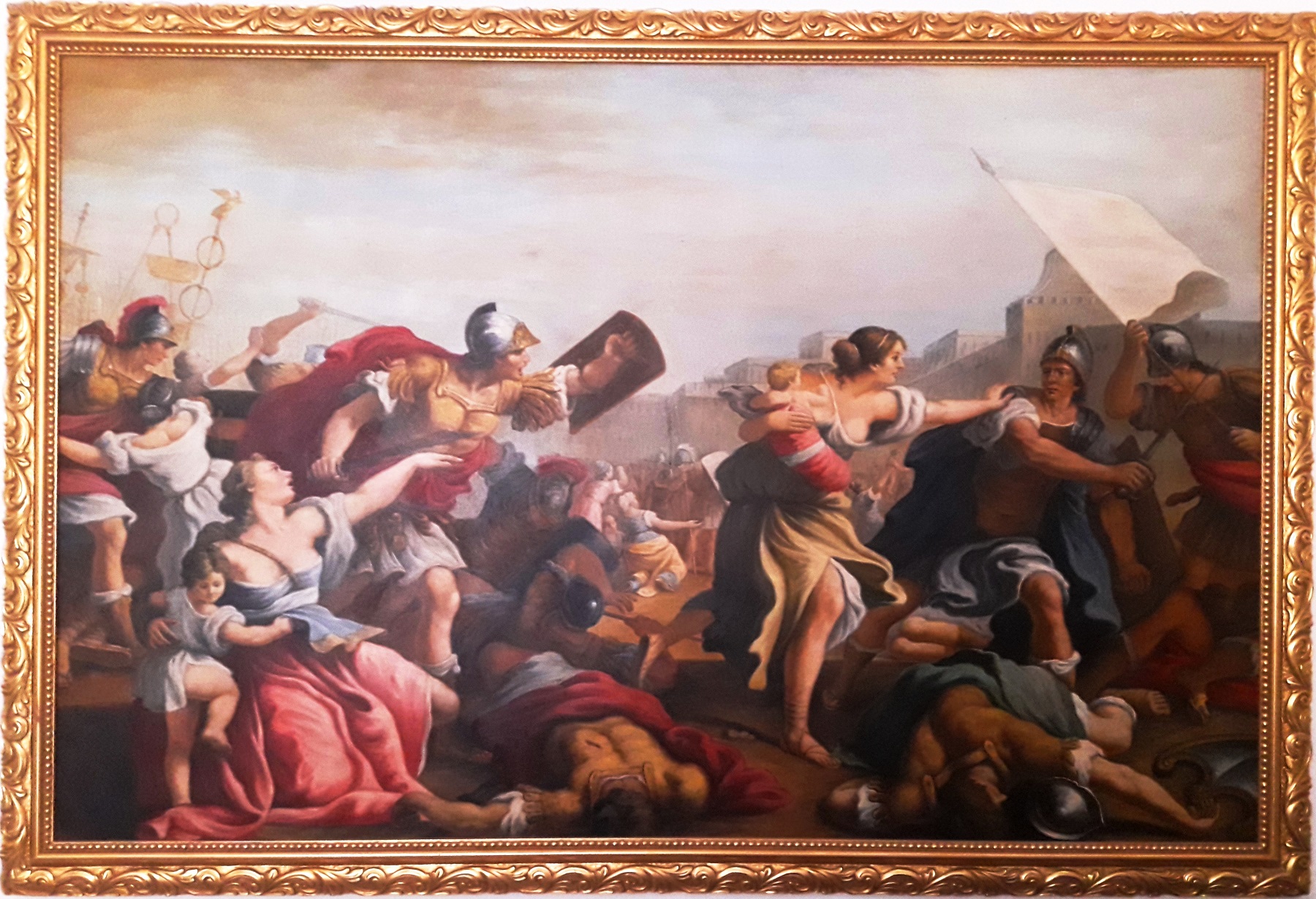 OLIO SU TELA. Sul tema “strage degli innocenti di vecchia fattura anni 50. Cornice in legno dorato richiamante stile settecentesco.Dimensioni 138x201.