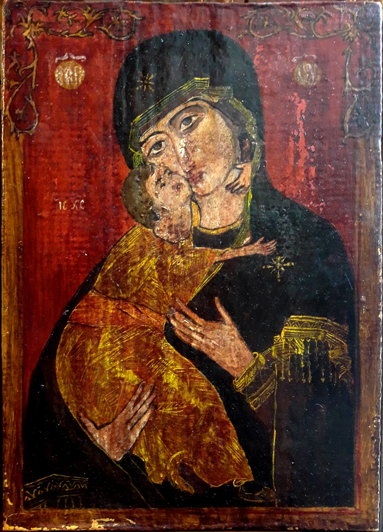 ICONA. "Madre di Dio e tenerezza”, icona realizzata su tela applicata su tavola con tecnica dell’affresco, corpo unico, di origine greca. Dimensioni cm 23x32,5