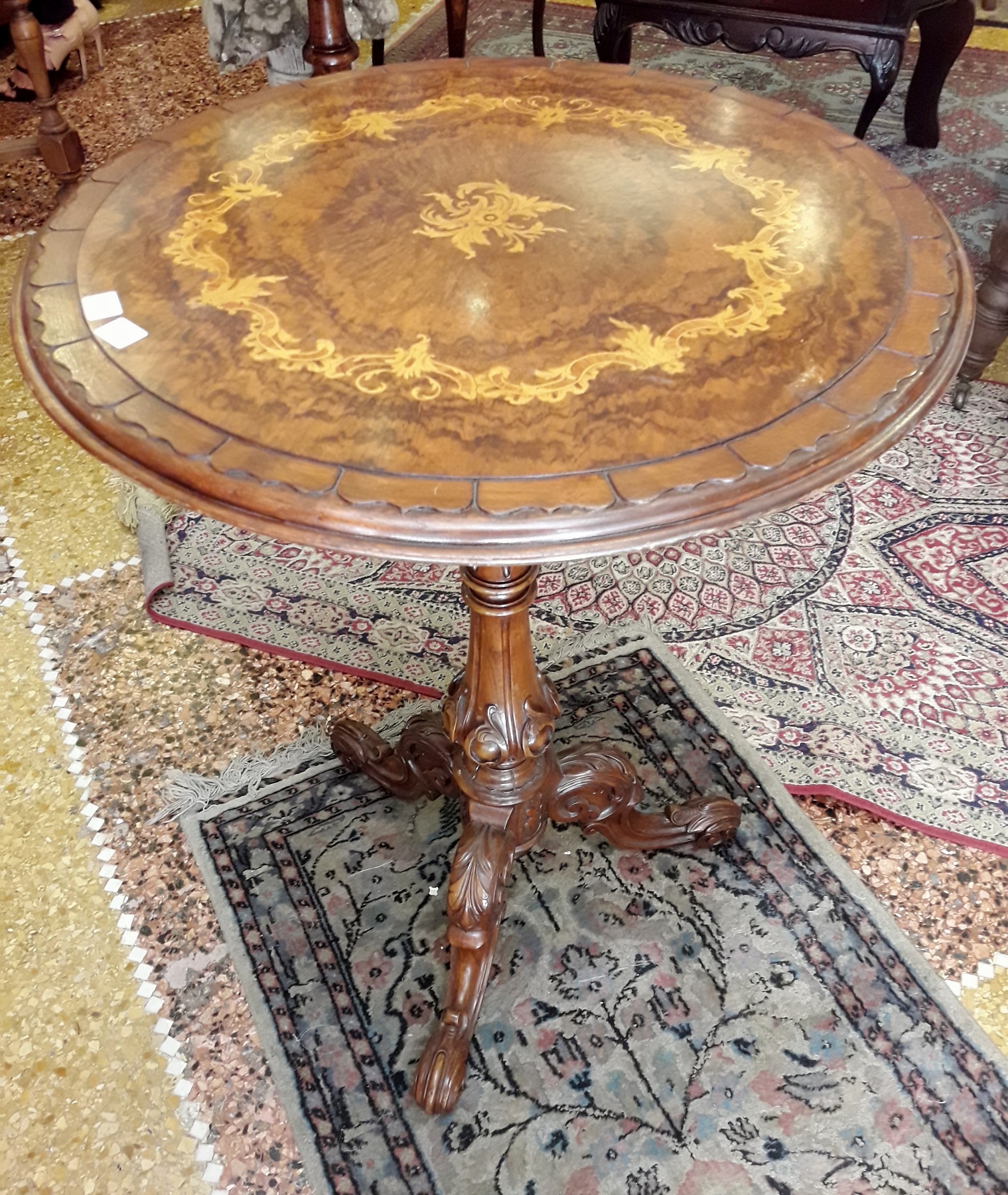 TAVOLINO. Realizzato in radica di noce di forma tonda, stile olandese, intarsiato in bosso. Dimensioni cm 55x73 H.