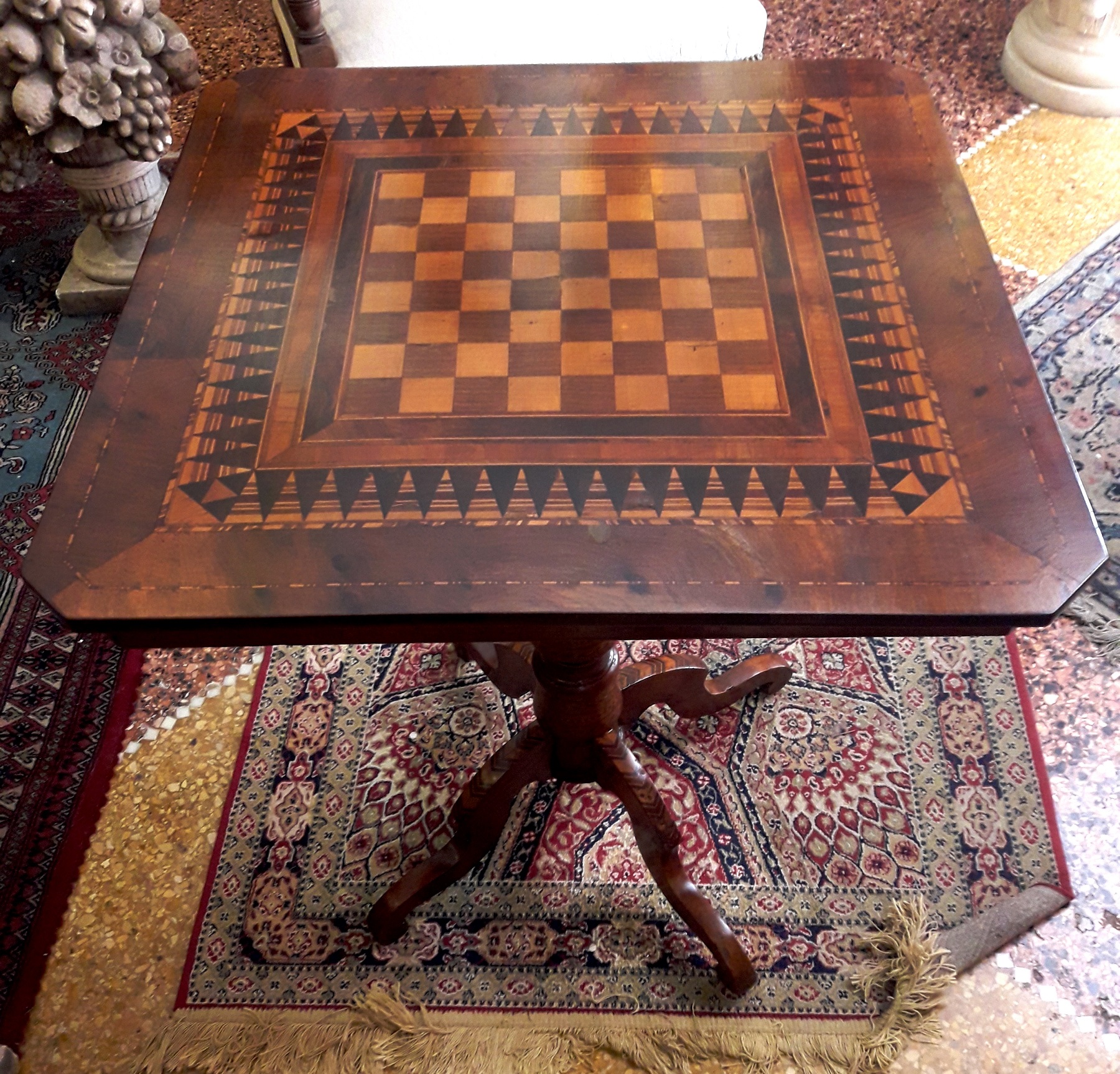 TAVOLINO. Stile sorrentino con scacchiera centrale, dotato di piccolo cassetto, decorato con intarsi in legno di frutto, realizzato interamente a mano in legno di noce. Dimensioni cm 60x60x70 H.
