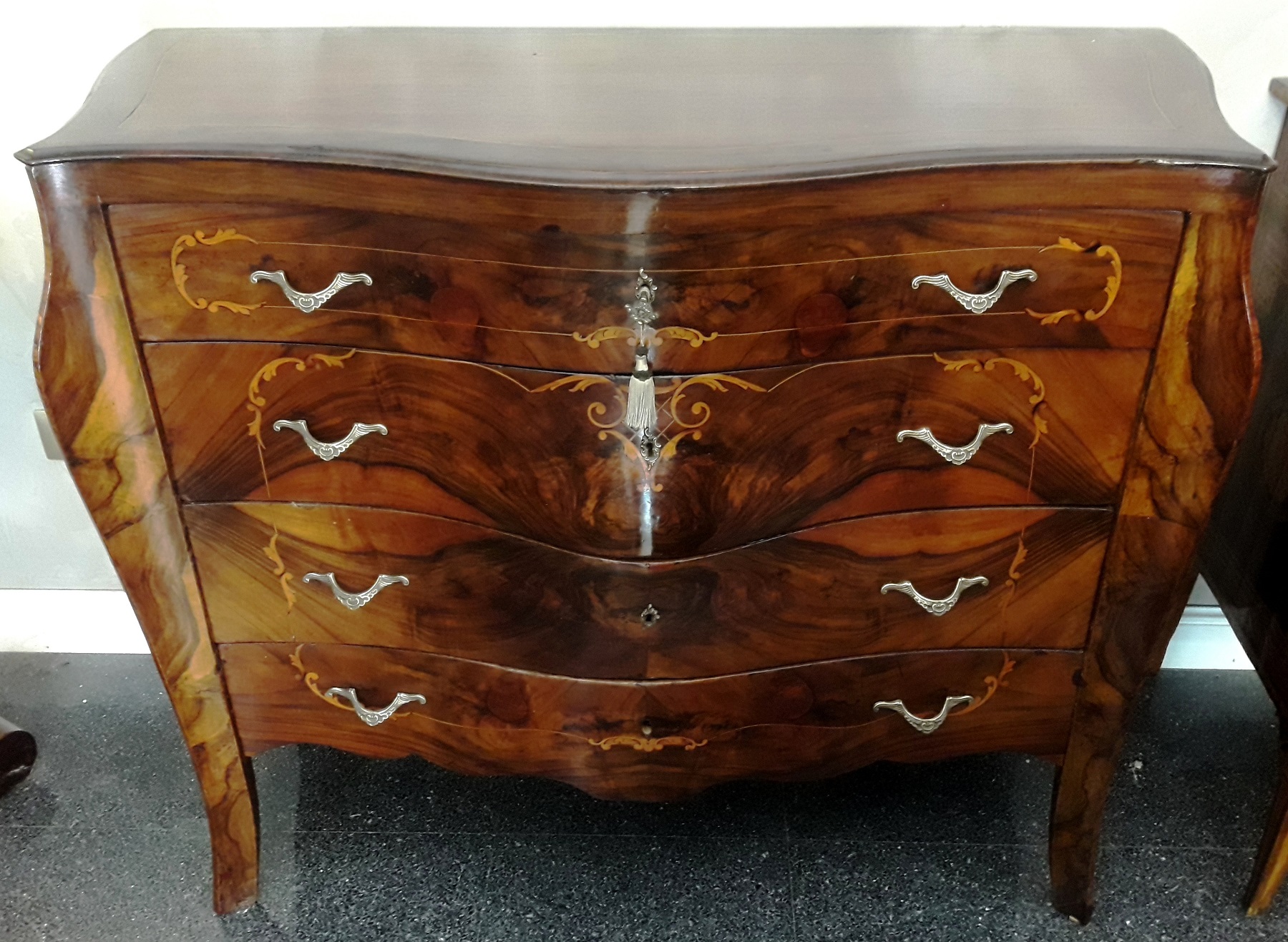 CASSETTONE. Provenienza lombarda, del fine 800. Lastronato in noce, Intarsiato a motivi floreali sulla parte frontale. Presenta 3 cassettoni più un cassetto, sagomati sotto a grembiule. Gambe rifinite “bois de rose”. Dimensioni cm 54x100x123 H.
