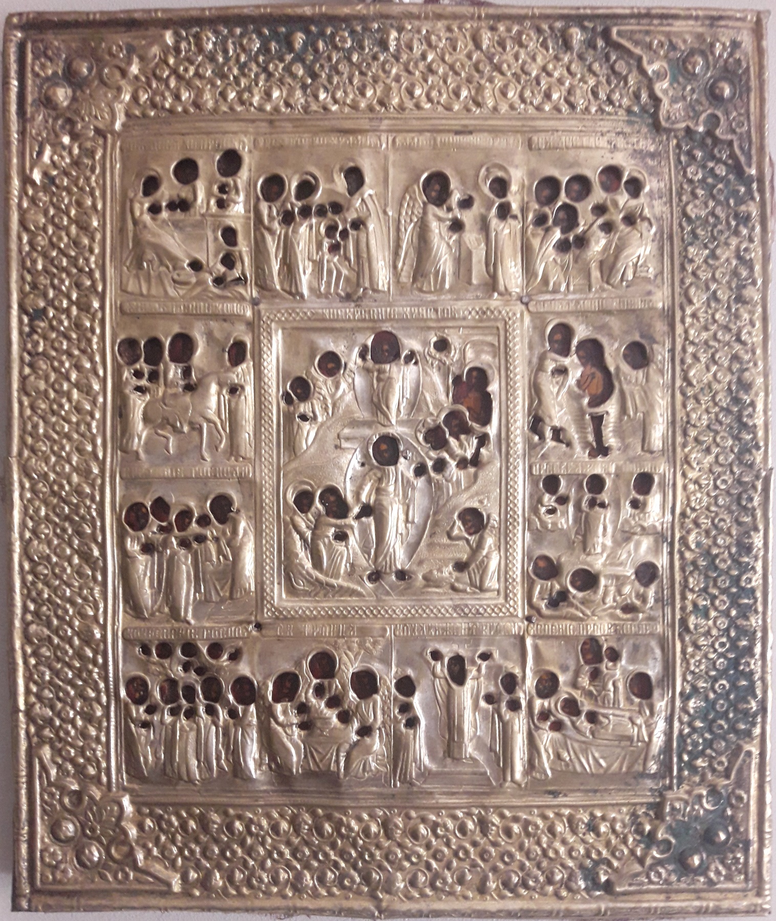 ICONA. Realizzata con risma in bronzo dorato a verreille. Raffigurazione delle 12 feste, databile intorno al ‘700. Dimensioni cm 26,5x31.