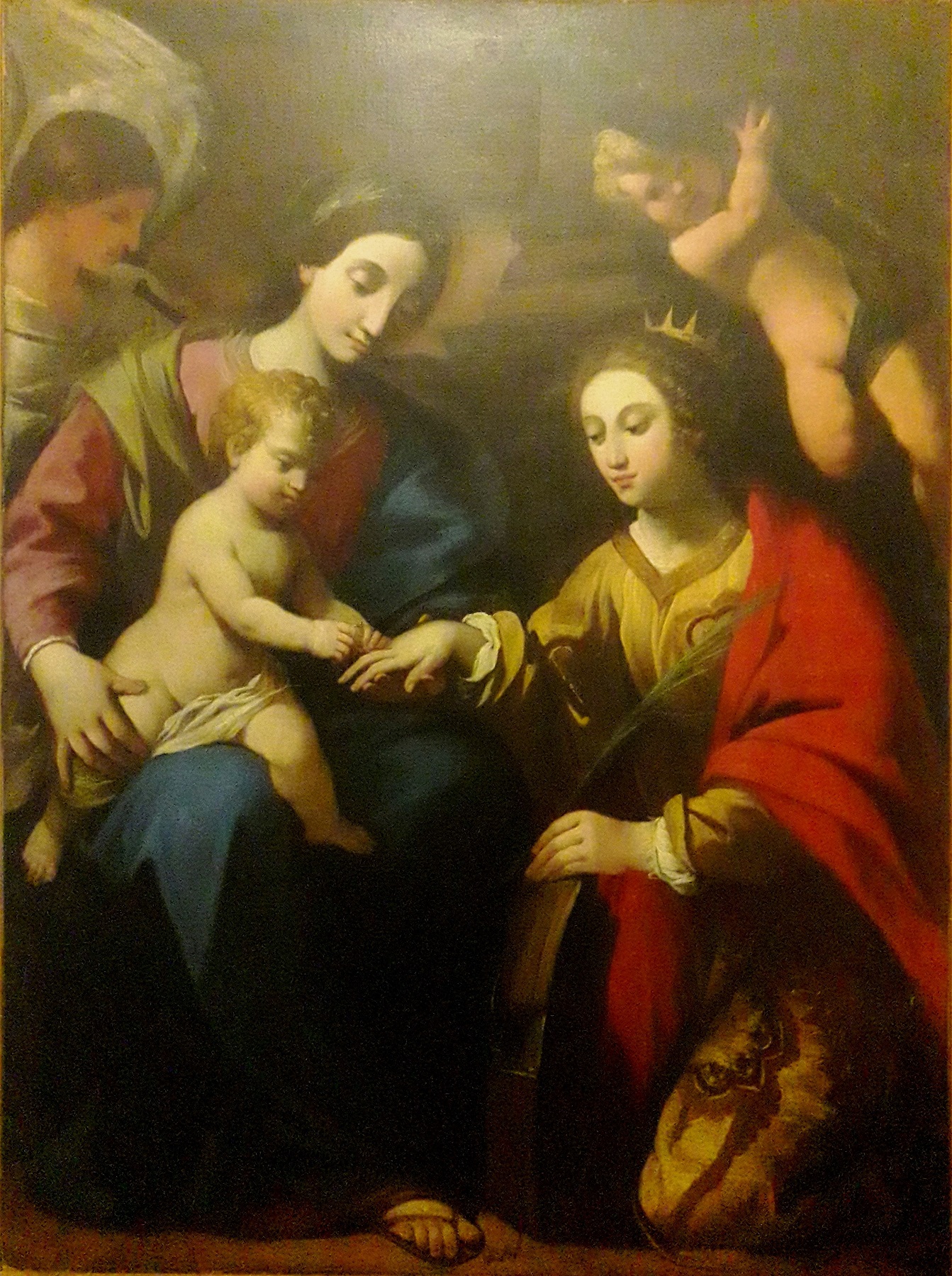 OLIO SU TELA. Sposalizio mistico di S. Caterina di Alessandria alla presenza di 2 angeli”. Opera di Giandomenico Cerrini( 1606-1681). Presente certificazione del prof. Emilio Negro. Dimensioni cm 99x 133,5.