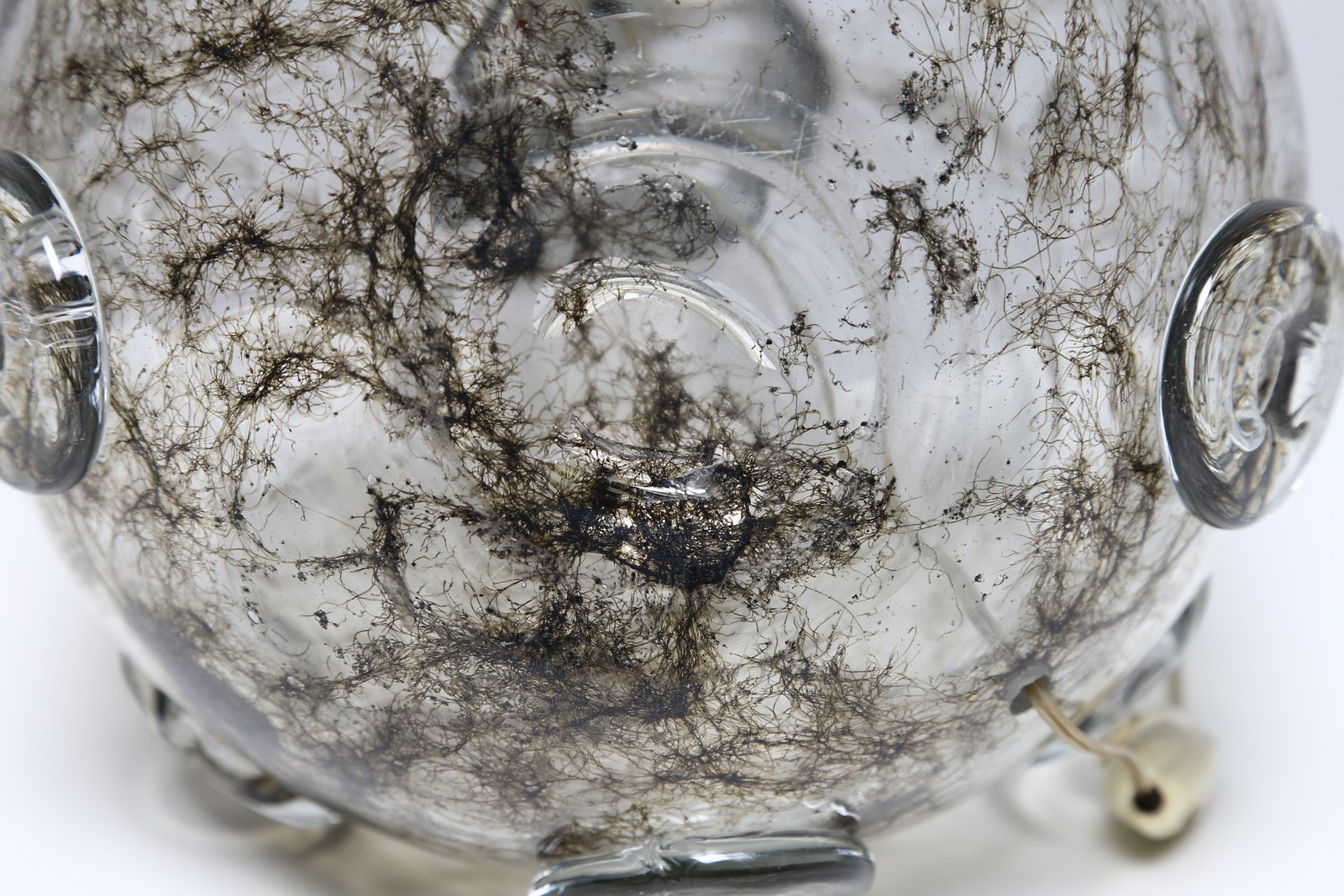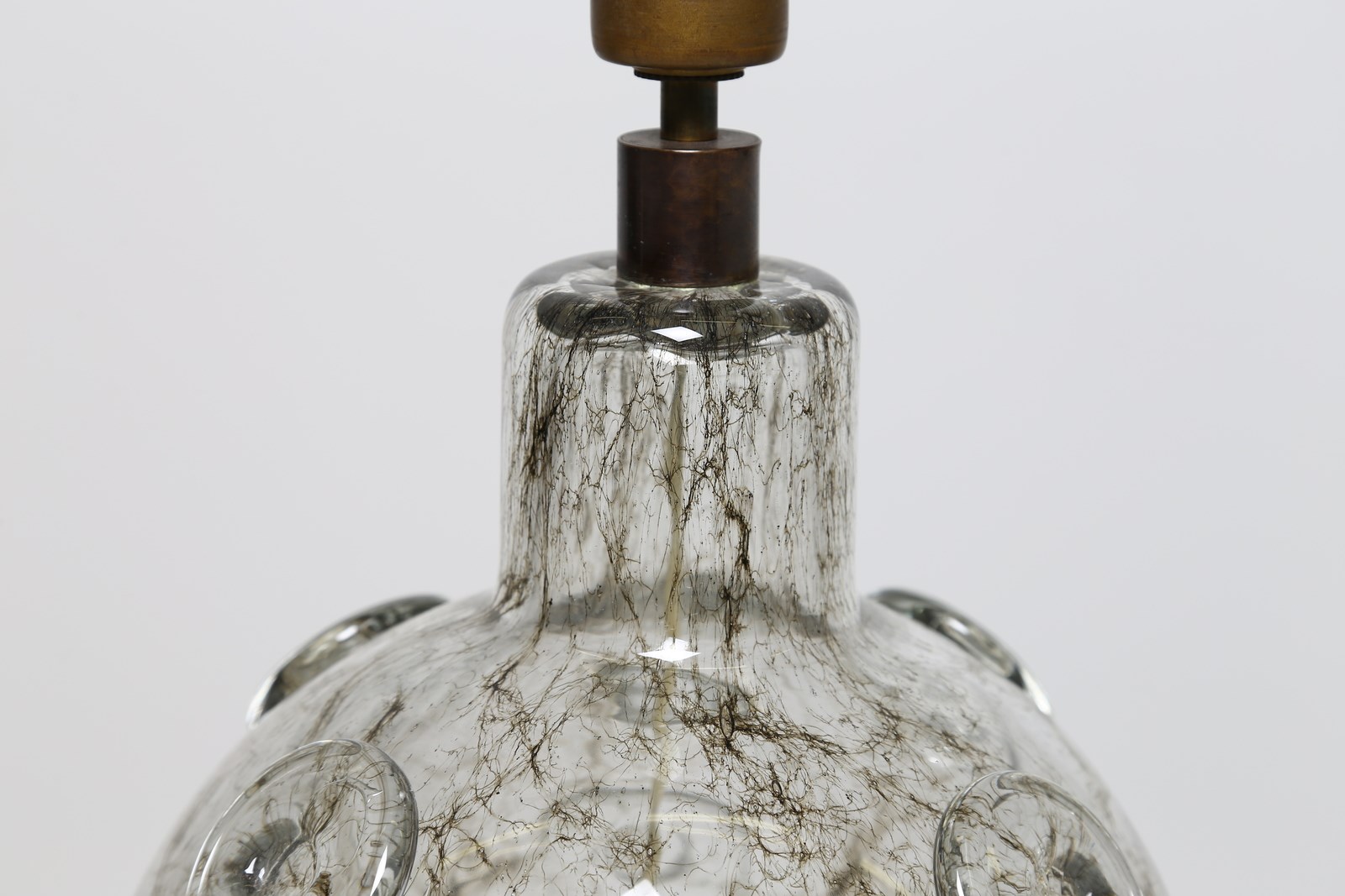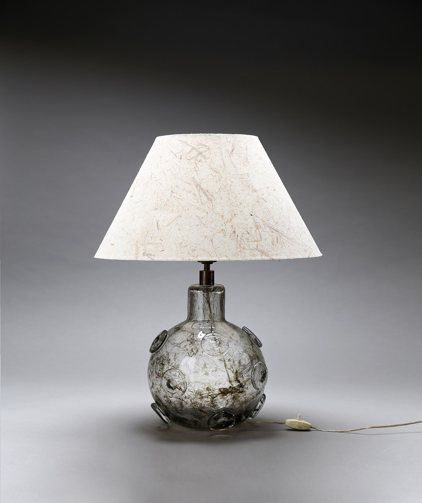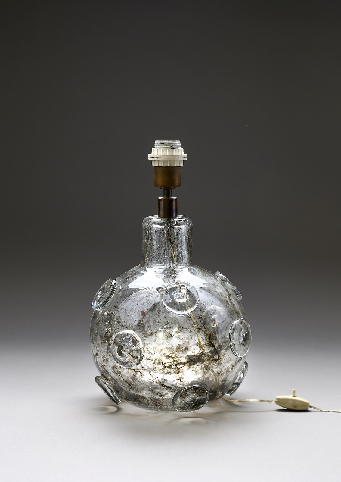 BAROVIER ERCOLE (1889 - 1974) Base lampada a forma sferica in vetro “crepuscolo” con applicazione di grossi anelli in vetro trasparente, per Ferro Toso Barovier, 1936 ca. . Vetro di Murano e ottone.. Cm 27,00 x 40,00 x 27,00. Riferimento: “Ercole Barovier” Marsilio ed. pag. 61 e “L’arte dei Barovier” Arsenale ed. pag.128.