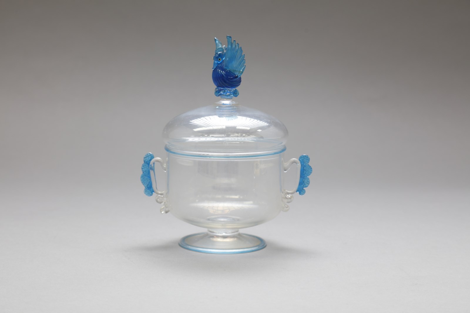 VETRERIA SALVIATI Potiche in vetro trasparente decorata con filamenti e figura animale color celeste, fine '800. Vetro di Murano.. Cm 16,00 x 20,00 x 12,00.