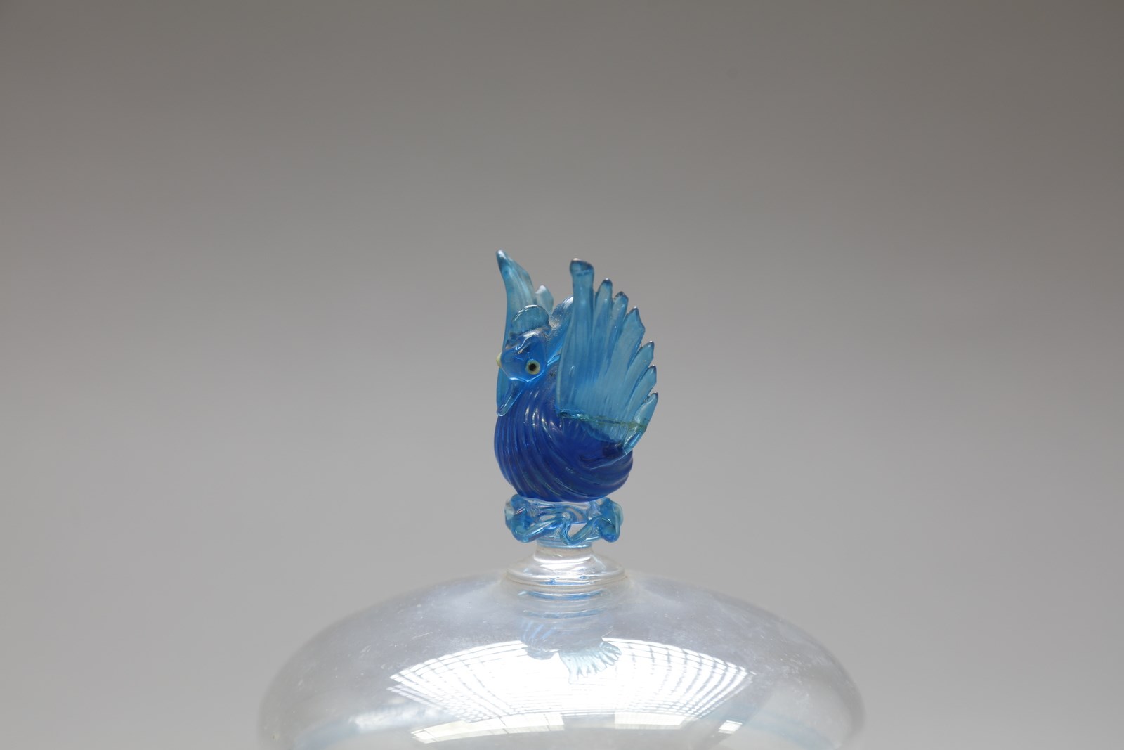 VETRERIA SALVIATI - Potiche in vetro trasparente decorata con filamenti e figura animale color celeste, fine '800.