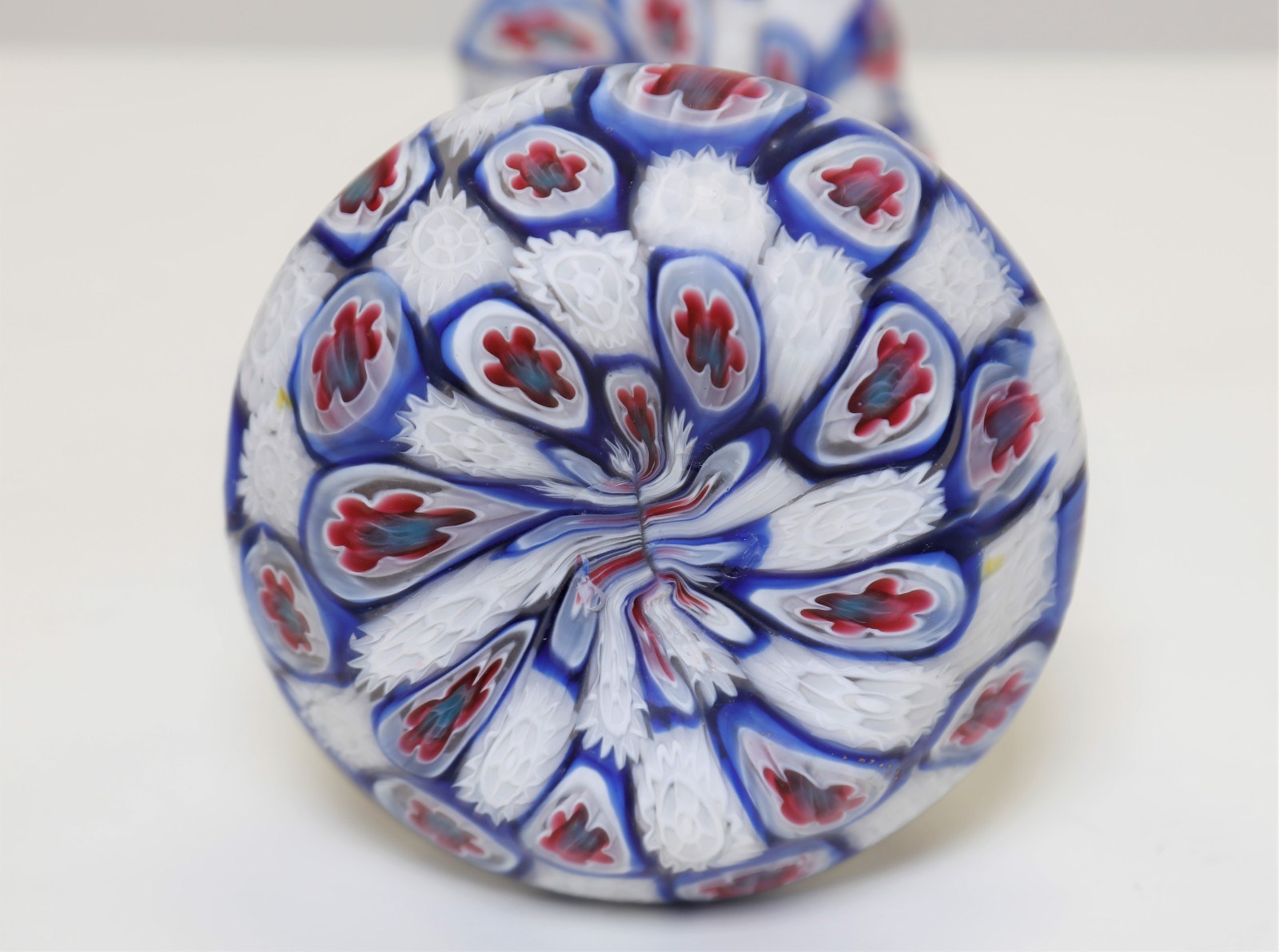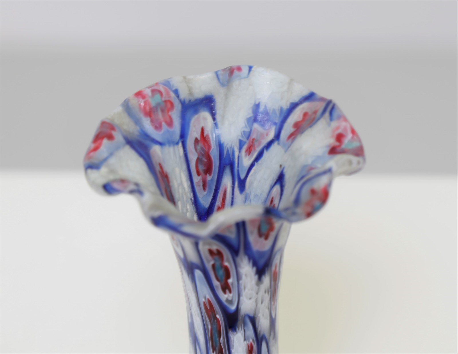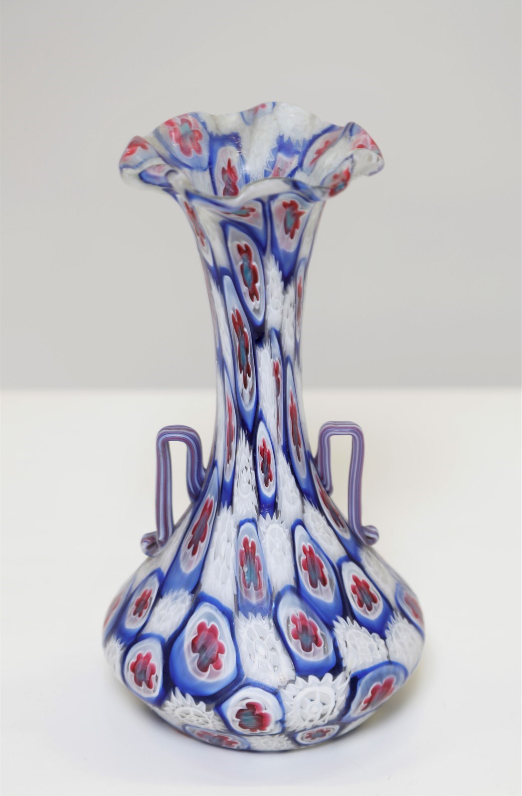 Lot 17 | FRATELLI TOSO - Vaso a murrine lattimo e rosso/celeste a distribuzione alternata, anse applicate. Primi '900.