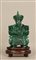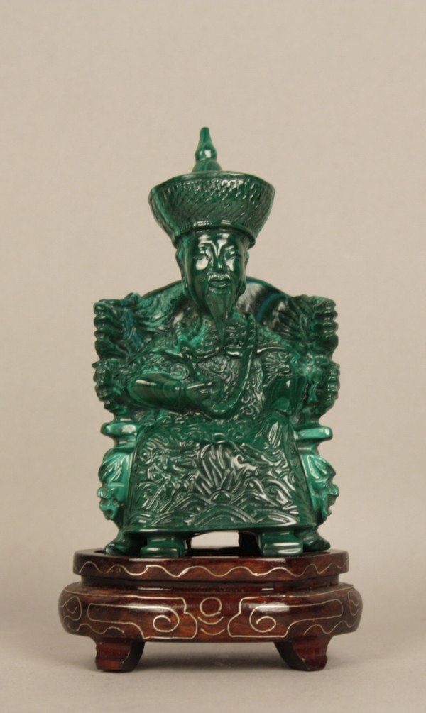 Firmato, datato. Scultura in malachite su base di legno raff. ''SANTONE SEDUTO''. Cina. Inizi XX secolo. Mis. Lung. cm. 5 Alt. cm. 9 ca.
