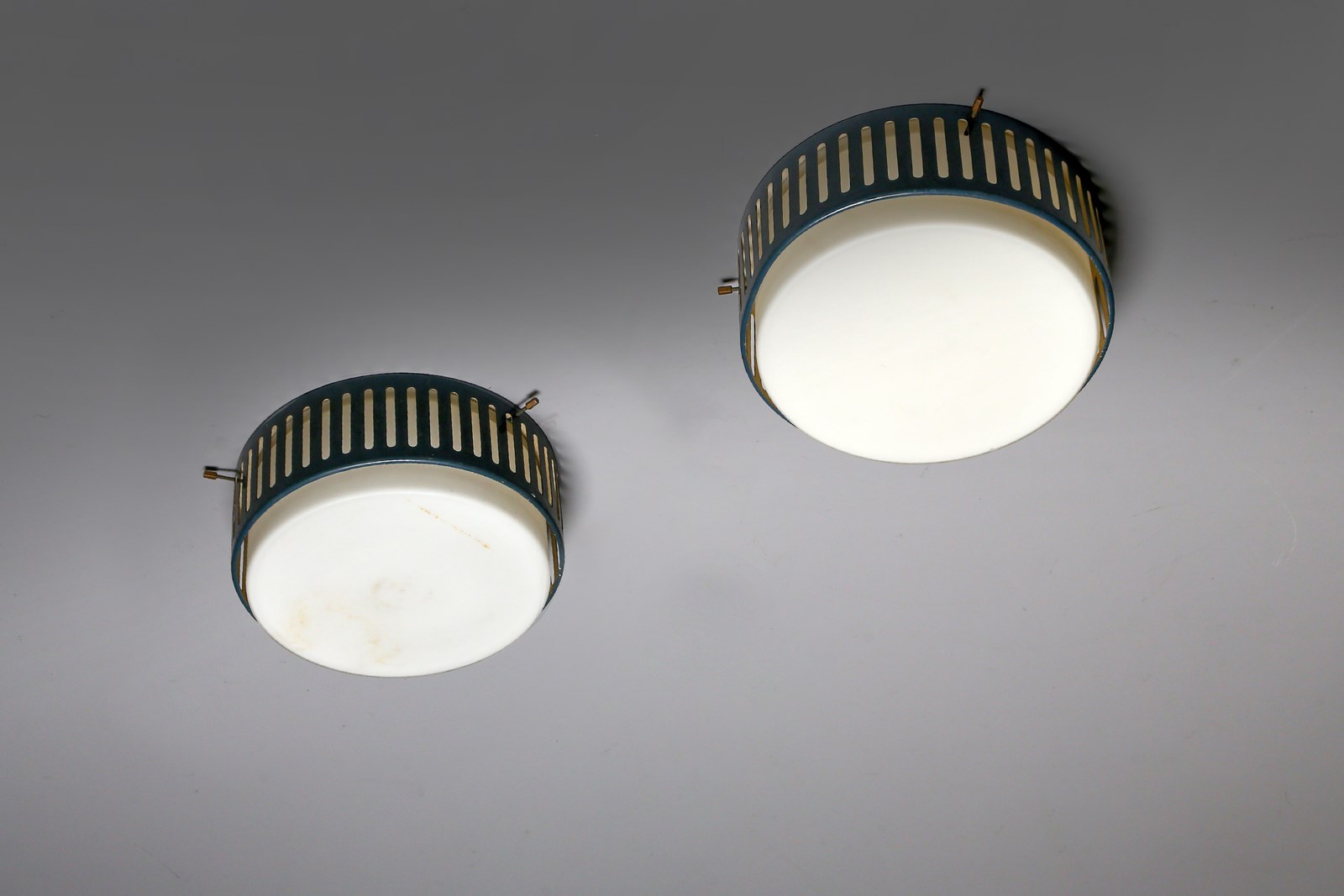 STILNOVO Coppia di lampade a sospensione modello 1206, anni '50. (2). Ottone e alluminio verniciato.. Cm 39,00 x 14,00 x 39,00. Marchio della manifattura. Bibliografia: Catalogo Stilnovo n. 11