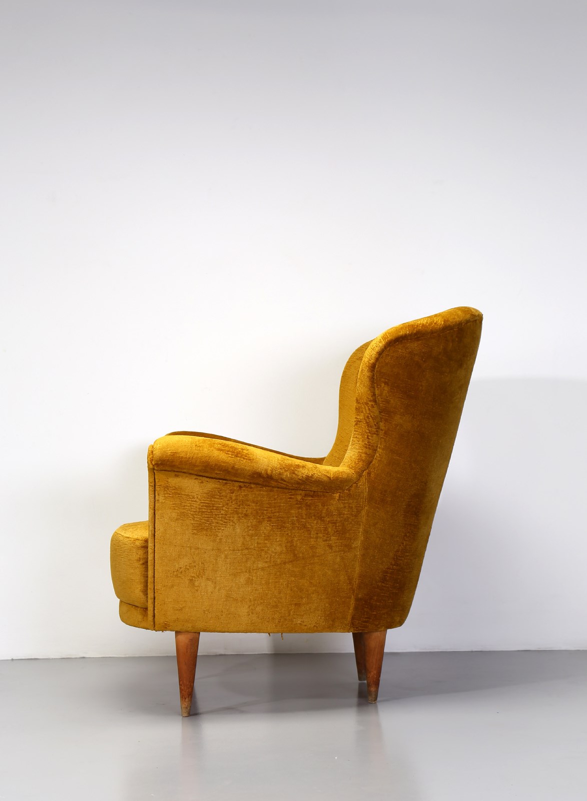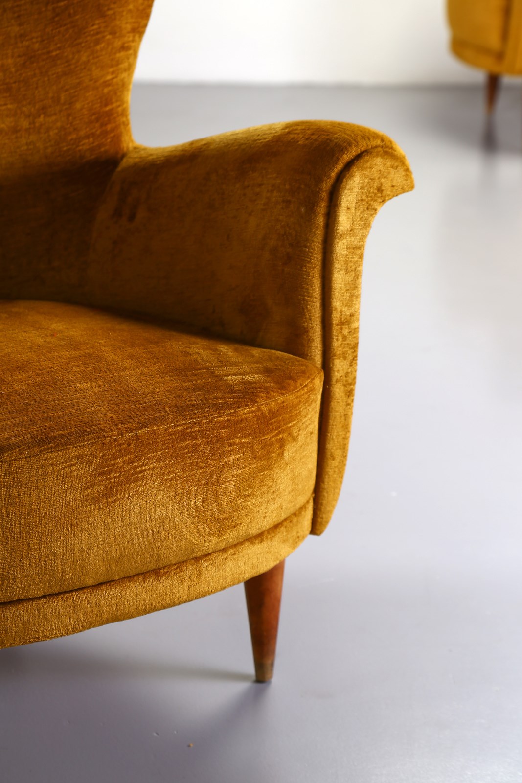 LACCA CESARE (n. 1929) (attribuito) Coppia di poltrone anni 50. (2). Legno e velluto imbottito.. Cm 81,00 x 86,00 x 60,00. Bibliografia (divano) ; Aloi, Esempi di arredamento moderno di tutto il mondo. Sale di soggiorno. Camini., Milano, Hoepli, 1951 fig. 217