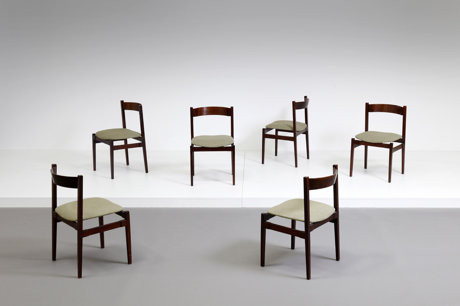FRATTINI GIANFRANCO (1926 - 2004) Sei sedie modello 107, produzione Cassina, 1961. Legno di palissandro e tessuto imbottito.. Cm 45,50 x 77,00 x 40,50. Bibliografia: Giuliana Gramigna, Repertorio del design italiano per l'arredamento domestico 1950-2000, Ed. Umberto Allemandi & C., Torino, 2003, p. 64.
