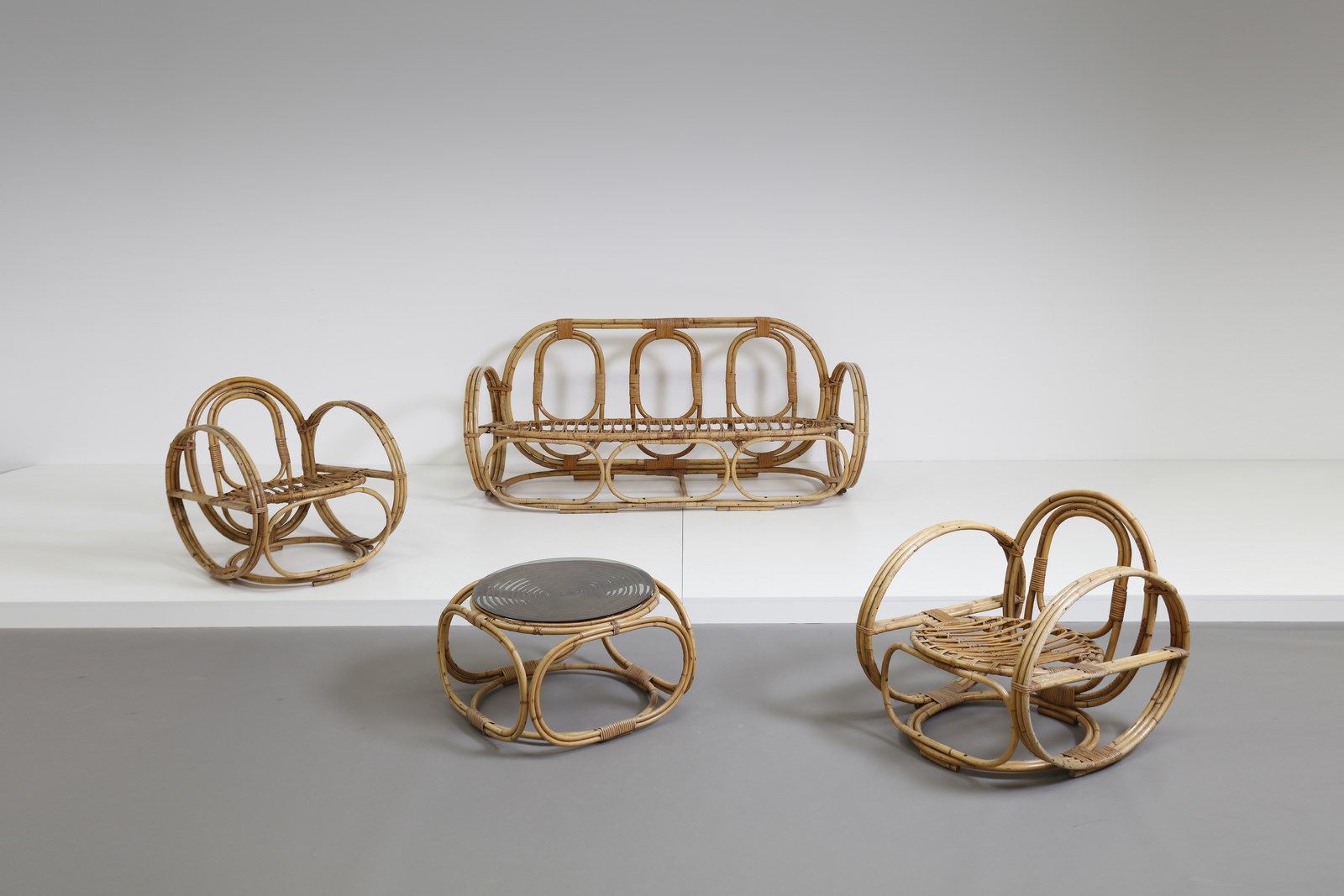 MANIFATTURA ITALIANA Salotto composto da un divano, due poltrone e un tavolino anni '50. . Bambù e cristallo molato.. Cm 172,00 x 70,00 x 70,00. Poltrone: 70 x 63,5 x 70 cm - Tavolino: 41 x 63 cm
