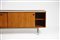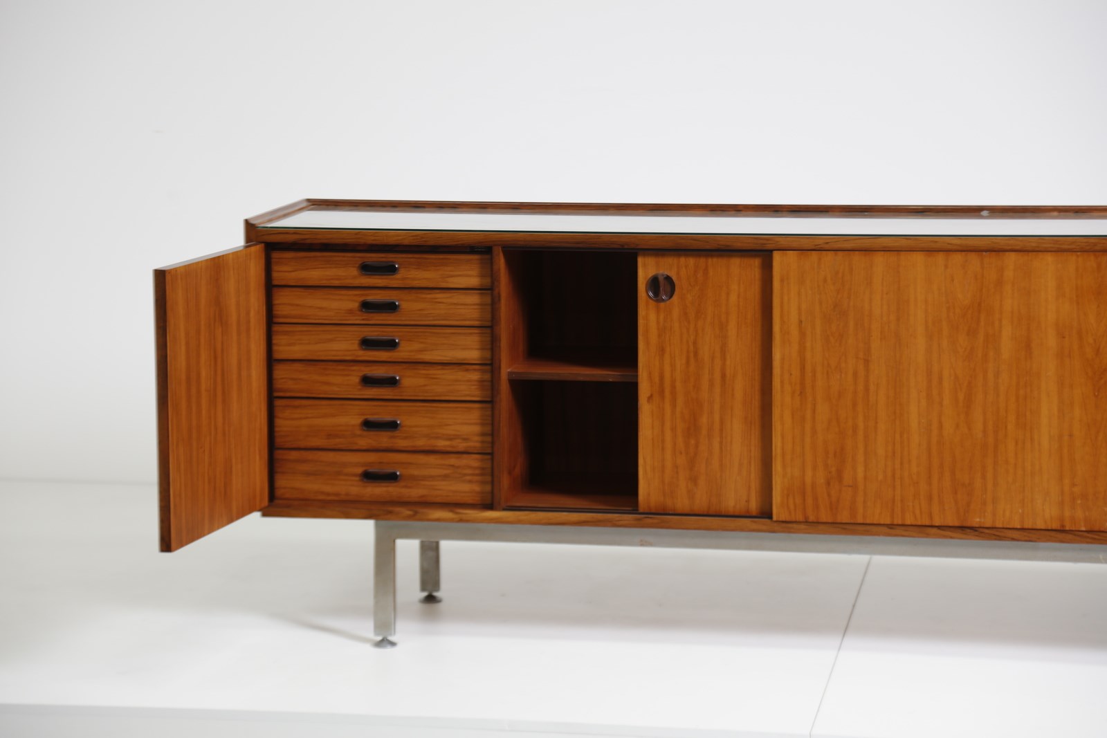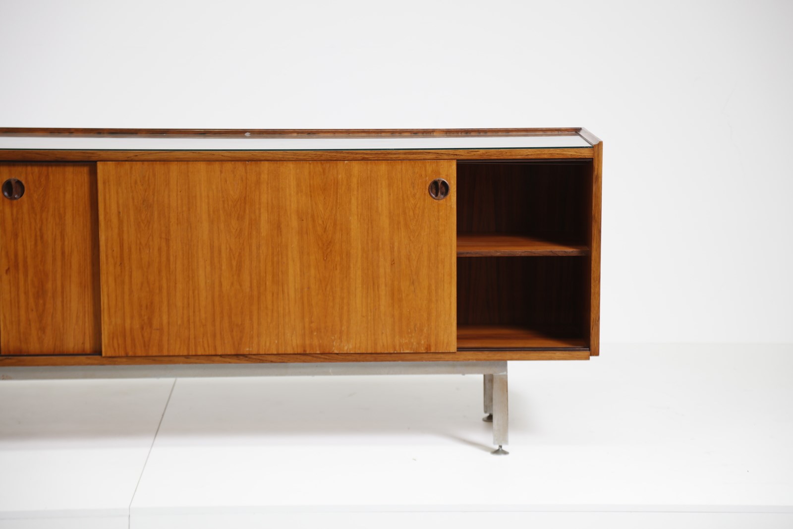 MANIFATTURA ITALIANA Credenza anni '50. Legno di teak e metallo. Cm 230,00 x 83,00 x 45,00.