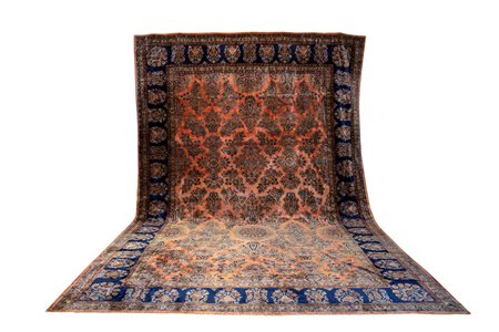 Grande tappeto persiano - fondo corallo con composizioni floreali a tutto campo; piccole bordure delimitano la cornice principale blu percorsa da composizioni in sequenza. cm 370x520
