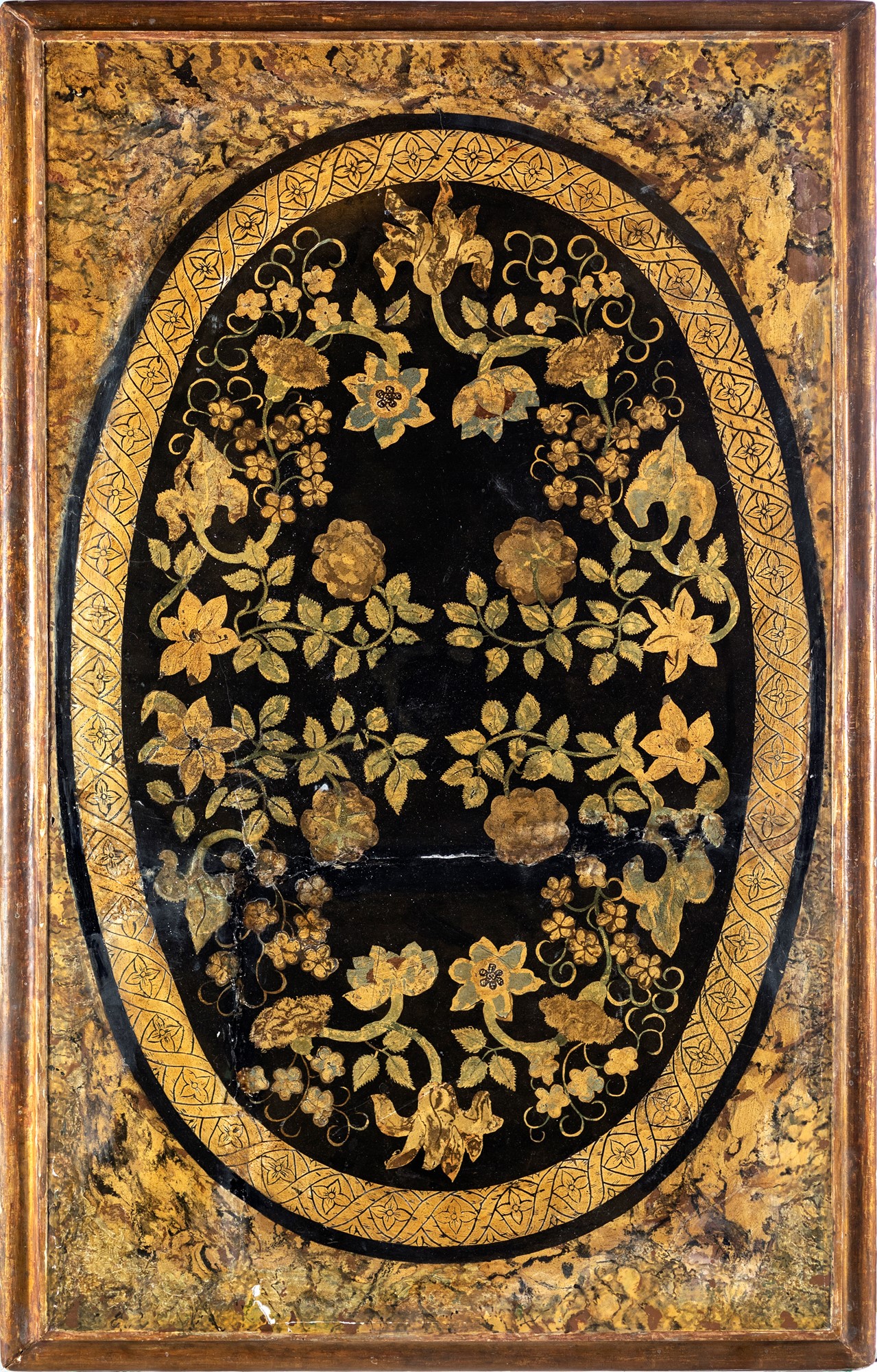 Piano rettangolare in scagliola, XVIII secolo - "decorato ad imitazione del marmo e centrato da grandi composizioni floreali racchiuse in un medaglione fondo nero incorniciato da bordura con corolle stilizzate entro motivo a treccia. cm 160x100