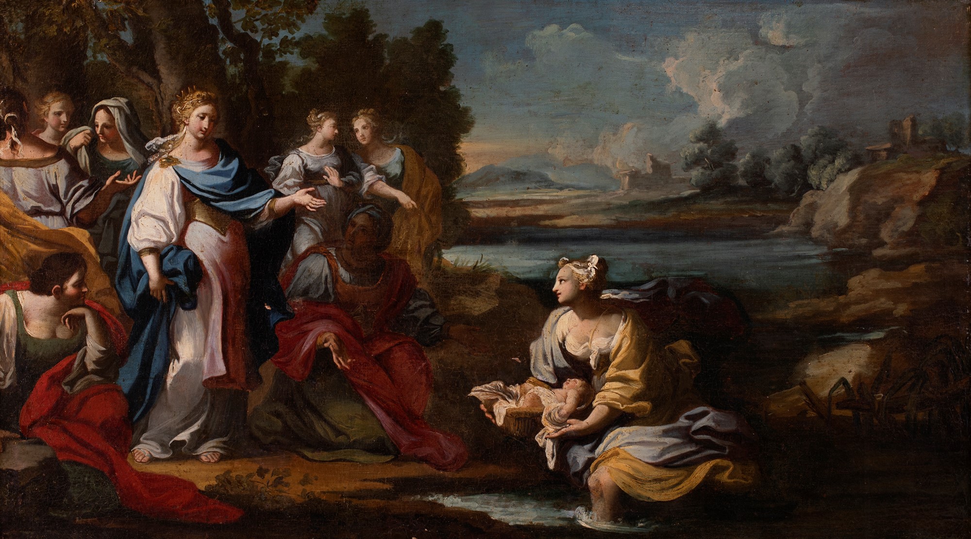 Ritrovamento di Mosé - Paolo de Matteis fu pittore piuttosto atipico dello scenario napoletano sullo scadere del XVII secolo e all'inizio di quello successivo, in virtù anche della sintesi tra linguaggio giordanesco e marattesco su cui improntò il proprio modulo espressivo. Il suo stile è per questo solitamente caratterizzato da un composto gusto arcadico, derivante per l'appunto dalla frequentazione con l'ambiente romano, in cui si fanno strada inserti tradotti dal repertorio di Francesco Solimena, come nella figura femminile che fa da quinta alla scena nel dipinto proposto. L'ancella che invece tiene tra le braccia Mosè ha la caratterizzazione fisionomica tipica del de Matteis, riscontrabile in numerosi suoi dipinti.- cm 57x100