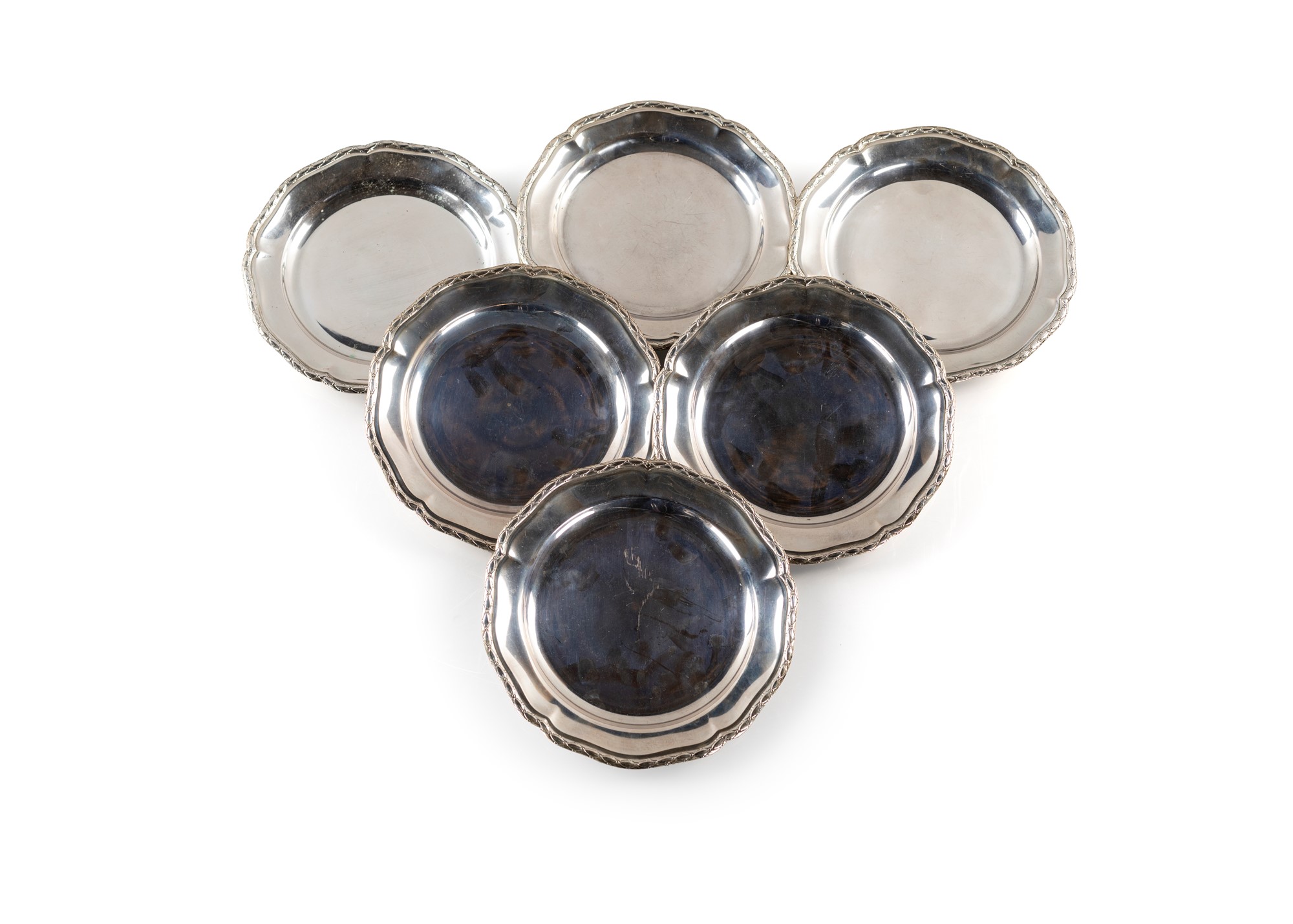 Sei piatti da dessert in argento - con profilo sagomato percorso da foglie. Segni d'uso. - diametro cm 19 - gr. 1214