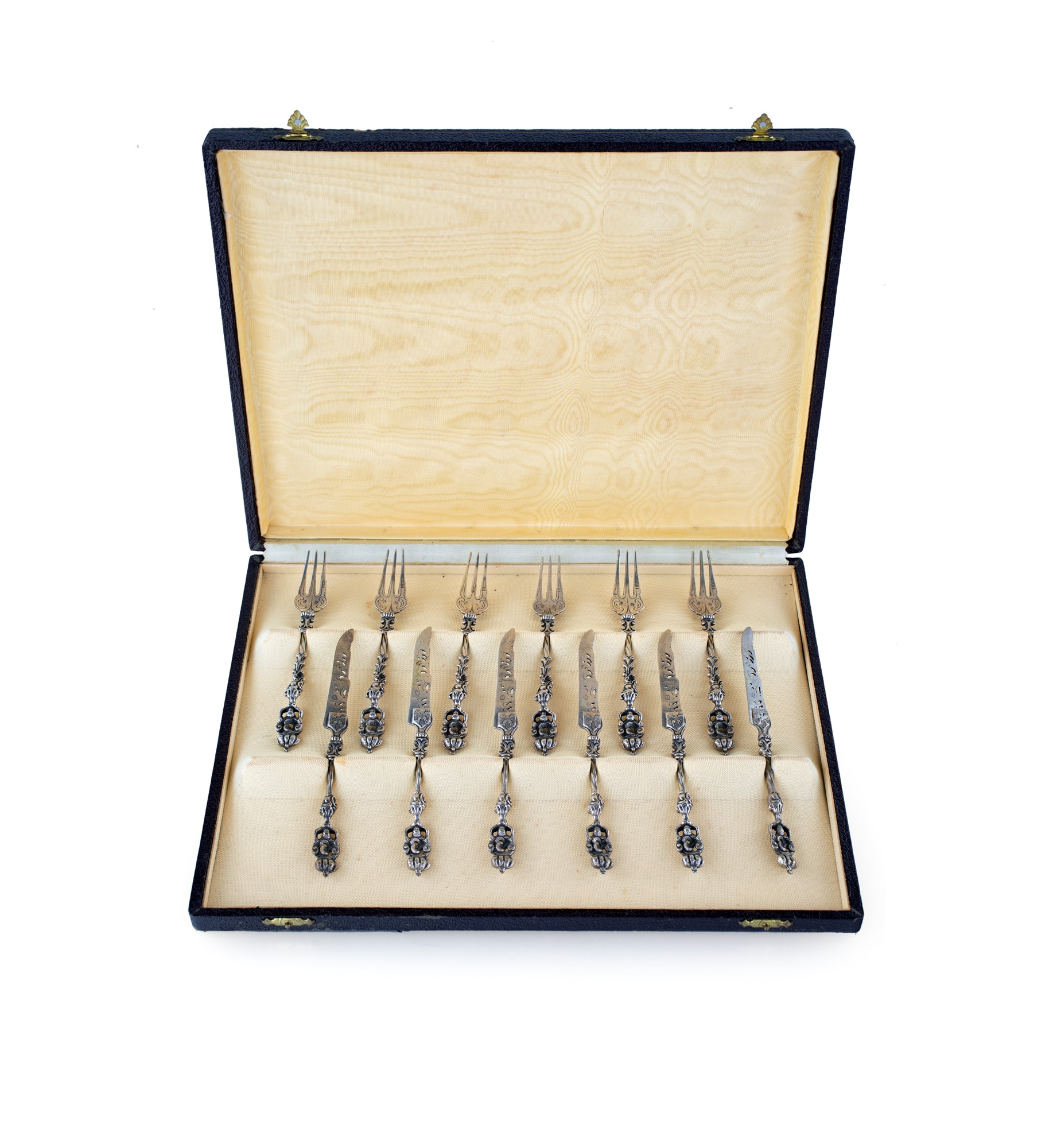 Set composto da sei coltelli e sei forchette in argento, Germania, XVIII...