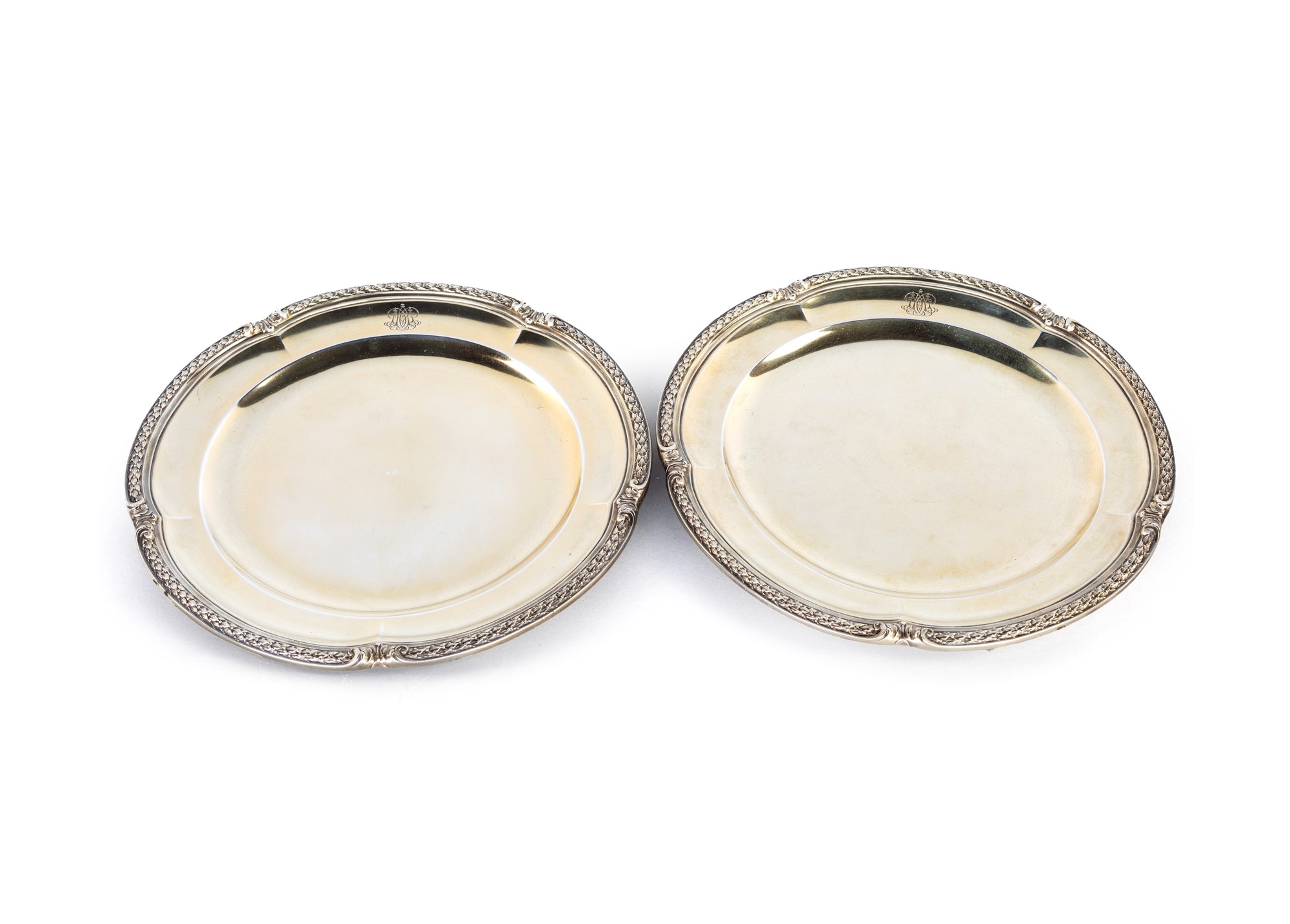 Coppia di piatti in argento dorato, argentiere André Aucoc, XIX secolo - con profilo impreziosito da foglie d'alloro cesellate interrotte da ricciolo; lungo la tesa elegante monogramma inciso. - diametro cm 26 - gr. 1064