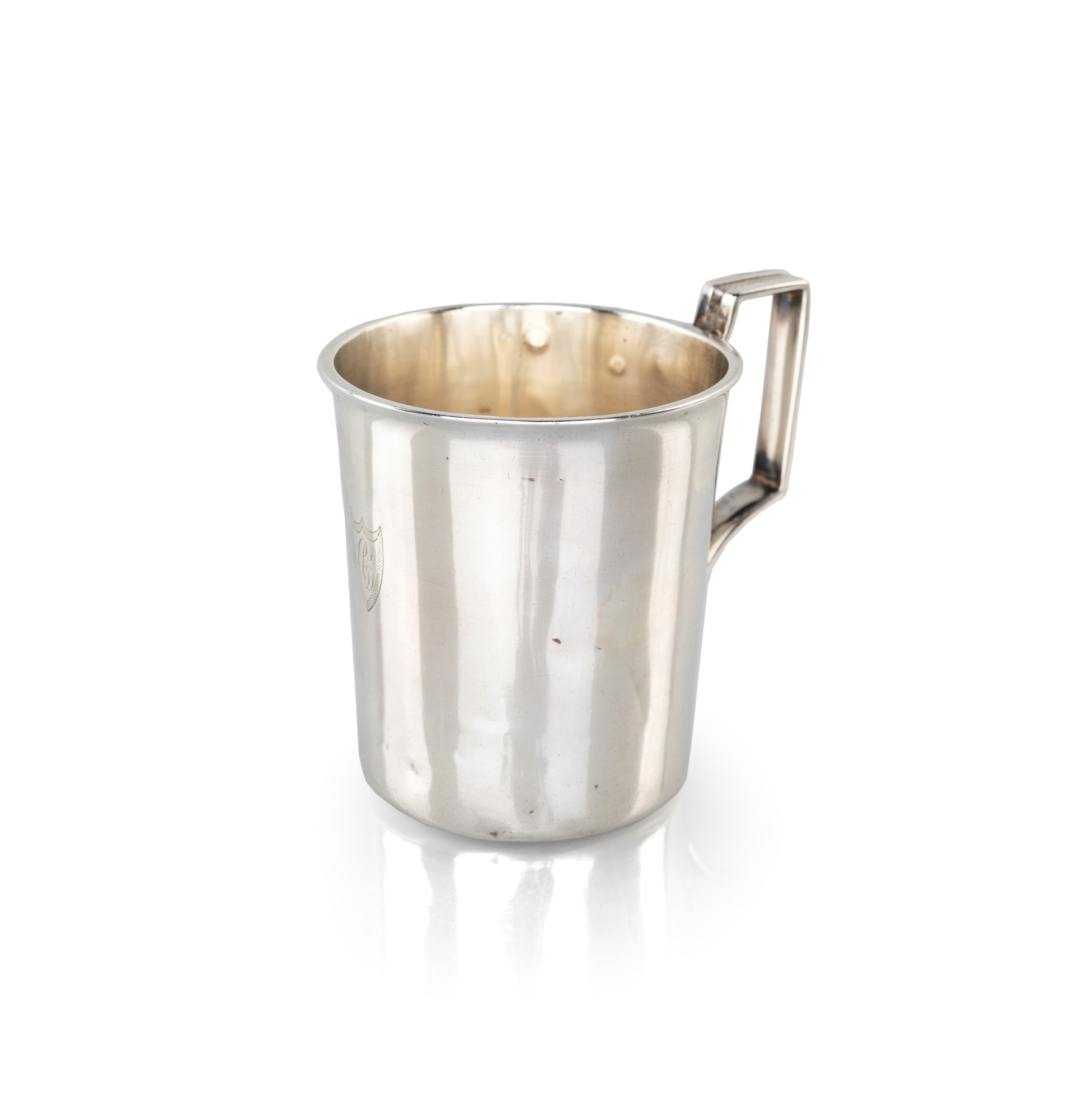 Boccale in argento 950/1000, Parigi 1794 - 1797, argentiere L.J.B. - corpo cilindrico a superficie liscia decorata da monogramma CC entro scudo inciso; manico squadrato impreziosito da una piccola bordura centrale con fitta decorazione a motivi geometrici. - altezza cm 10 - gr. 198