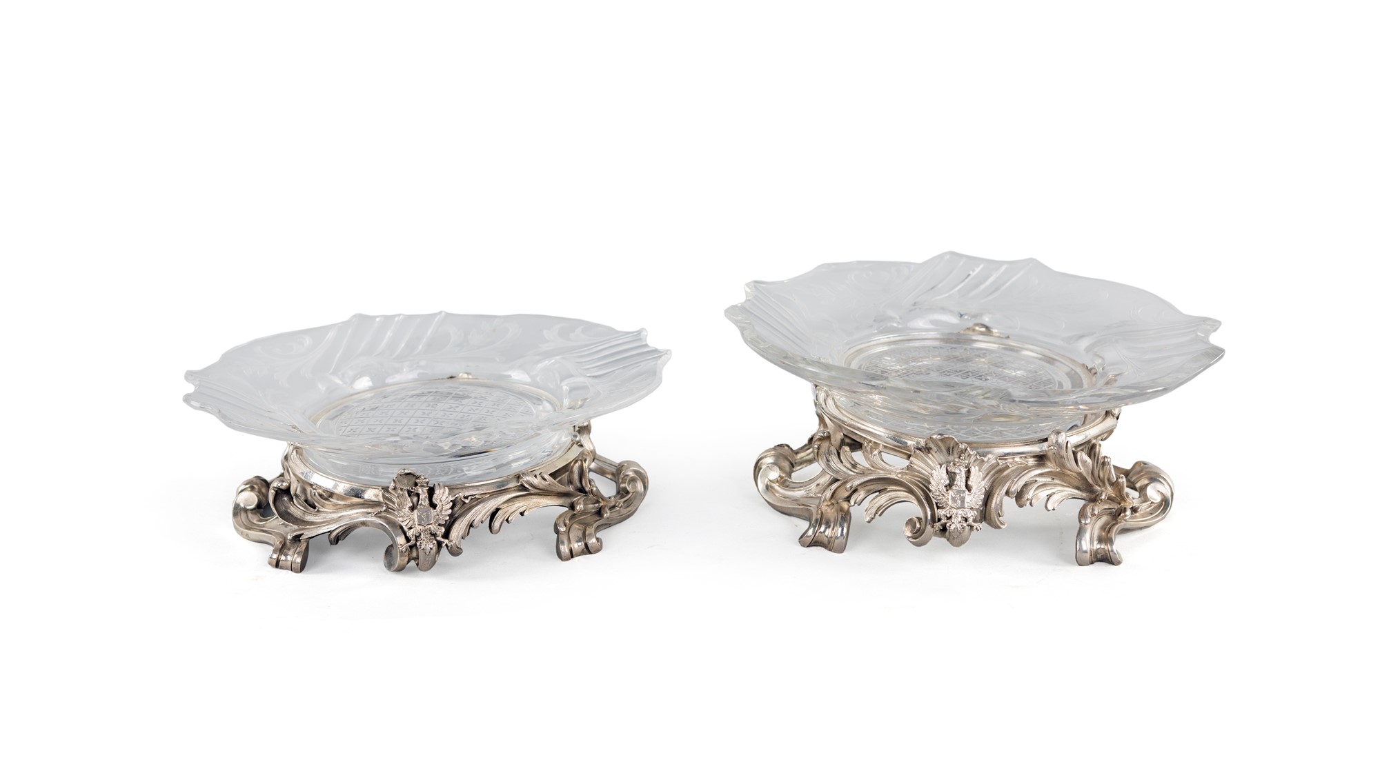Due alzate in argento e cristallo, Francia, dopo il 1838 - con supporto costituito da volute e cartigli a trattenere la coppa in cristallo dal profilo mistilineo. - cm 8x24 e cm 11x25 - gr. 1.598