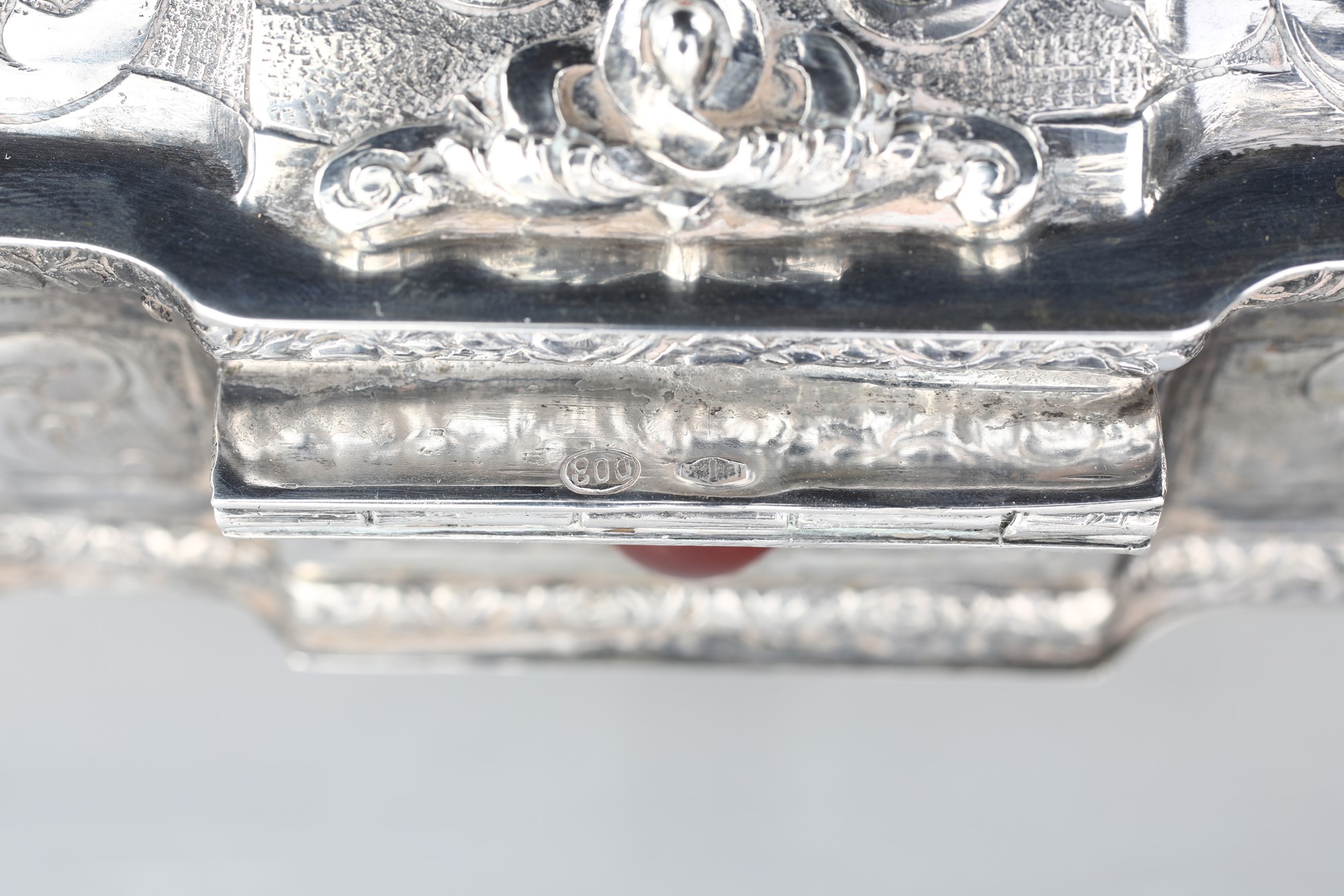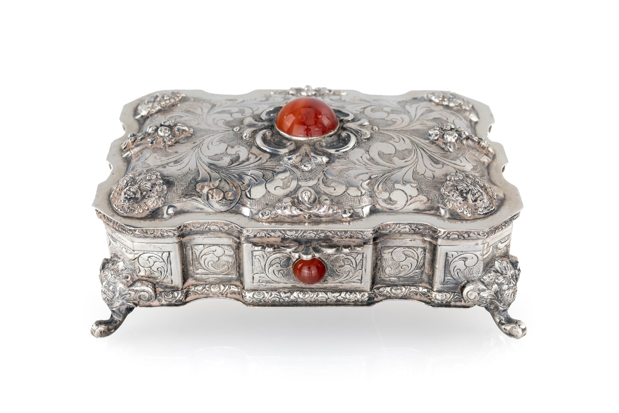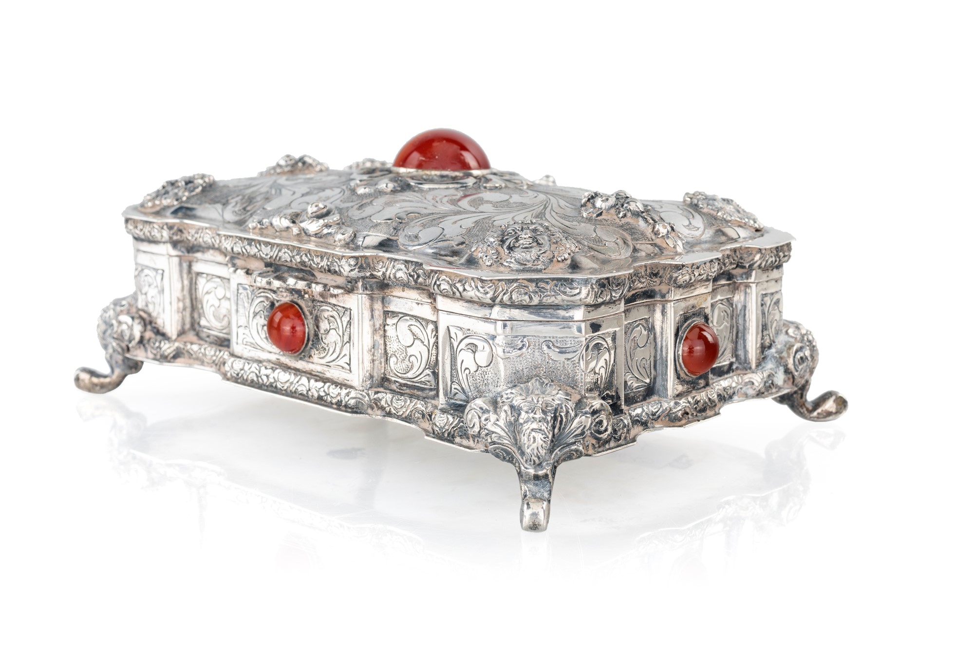 Cofanetto portagioie in argento, Firenze 1935 - 1945 - di forma sagomata poggiante su piedini angolari, interamente decorato a volute vegetali incise e sbalzate ed impreziosito da cinque corniole cabochon. Bollo fascio littorio. - cm 8x19x13 - gr. 860