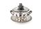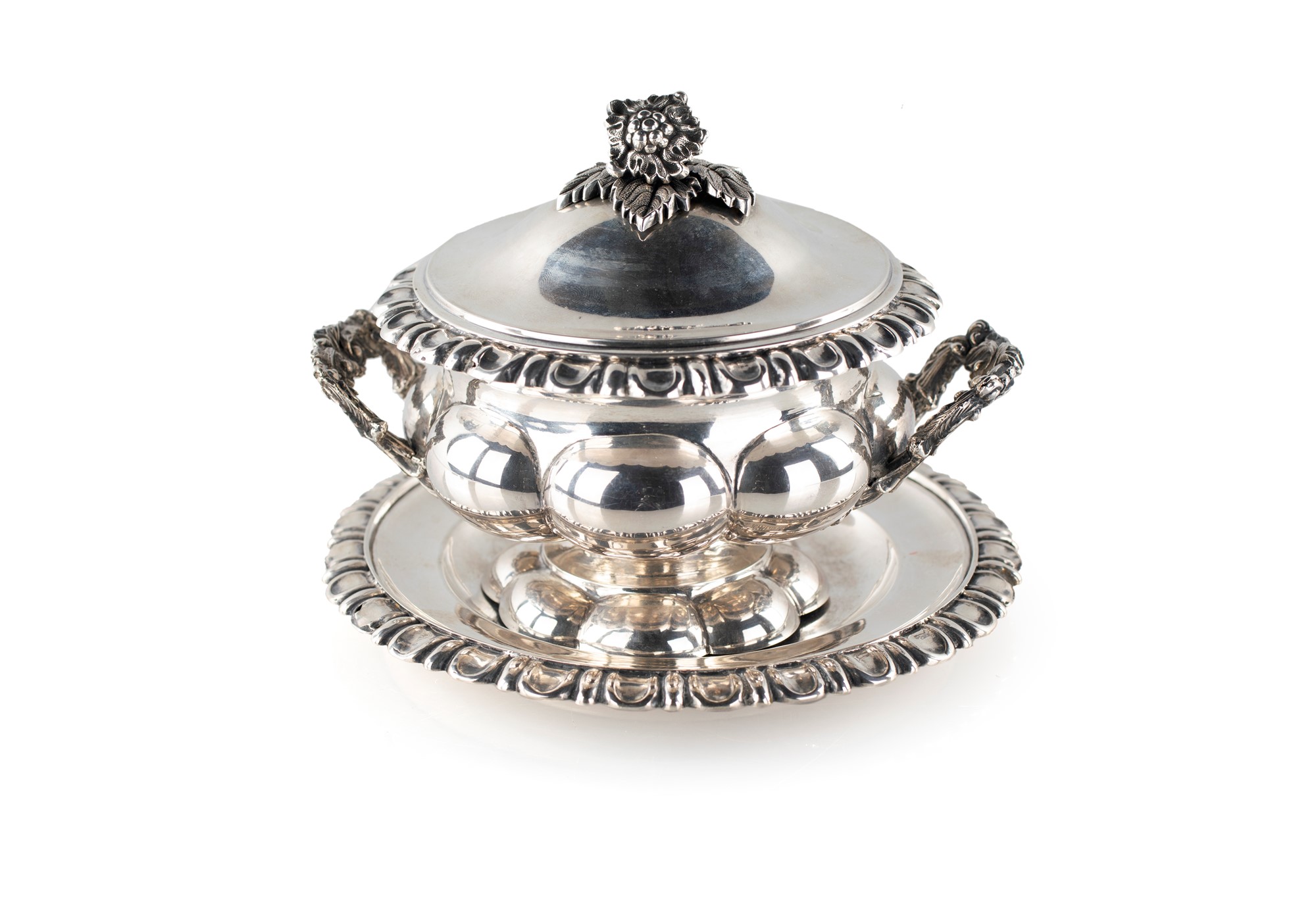 Tazza da puerpera con piatto in argento, Regno di Sardegna, Torino, argentiere Carlo Balbino (attivo dal 1798 al 1824) - corpo baccellato con coperchio sormontato da un fiore; piede polilobato; piatto con ciglio percorso da unghiature. - cm 13x17,5x14; piatto diametro cm 18 - peso complessivo gr. 578