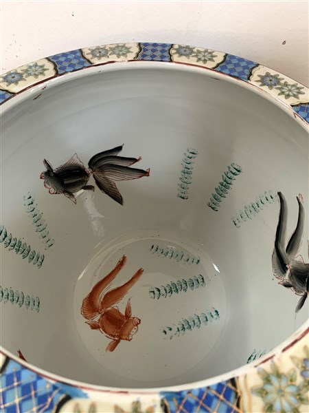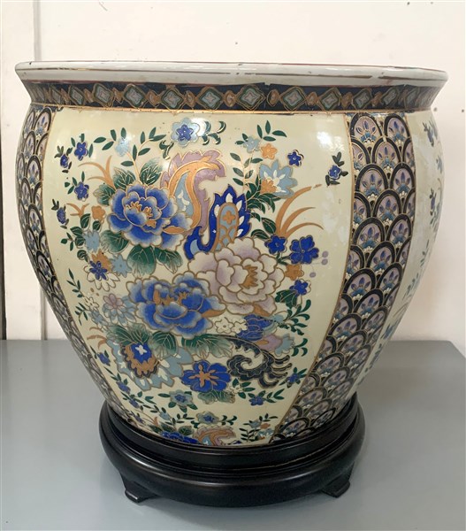 Cachepot in porcellana policroma a decoro floreale, base in legno. Cina, sec. XX (d. cm 42; h. cm 34,5) (difetti e segni d'uso)