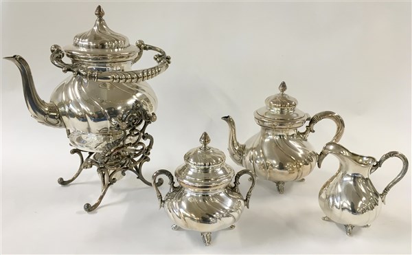 Servizio in metallo argentato composto da bollitore con fornello, teiera, lattiera e zuccheriera (difetti)