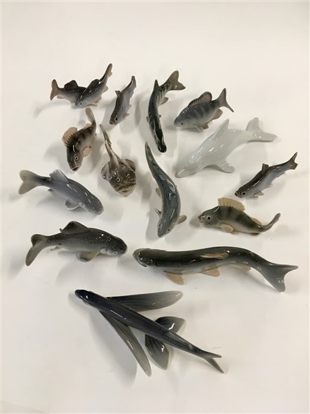 Manifattura danese. Lotto di quattordici sculturine raffiguranti pesci, misure