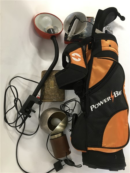 Lotto composto da due lampade da tavolo, una sacca da golf,un vecchio rasoio Re