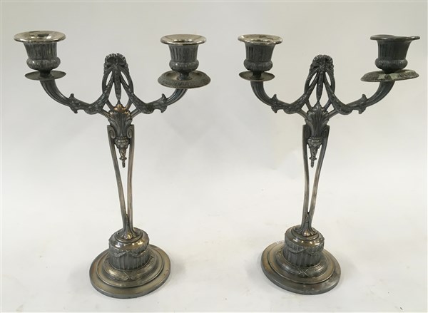 Coppia di candelieri a due fiamme in metallo con decoro liberty. (h cm 33) (dif