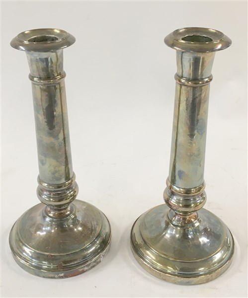Coppia di candelieri in metallo argentato a corpo liscio (h cm 22) (difetti)