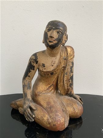 Figura di monaco inginocchiato in legno intagliato, dorato e laccato Thailandia