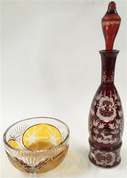 Lotto composto da una bottiglia ed una ciotola in vetro e cristallo molato, con