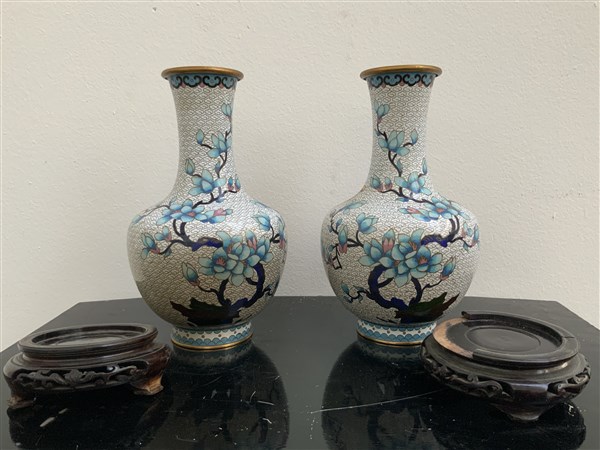 Coppia di vasi a bottiglia in smalto cloisonné a fondo bianco e decorazioni floreali, con basi in legno