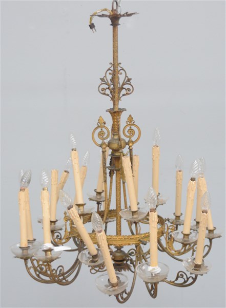 Lampadario a venti luci in metallo dorato e cesellato a palmette e motovi veget