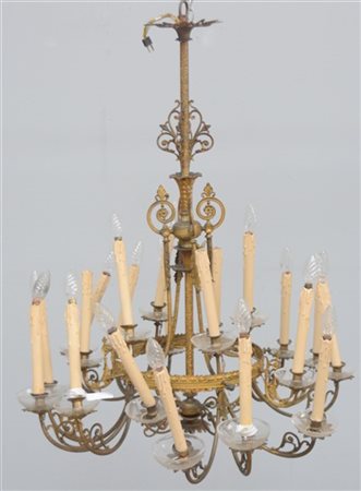 Lampadario a venti luci in metallo dorato e cesellato a palmette e motovi vegetali, fine del secolo XIX (h cm 95) (difetti)