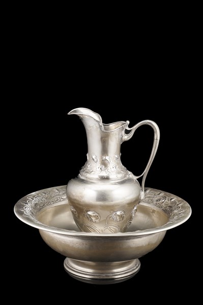 Manifattura austriaca, inizio secolo XX. Grande acquamanile con bacile in metal